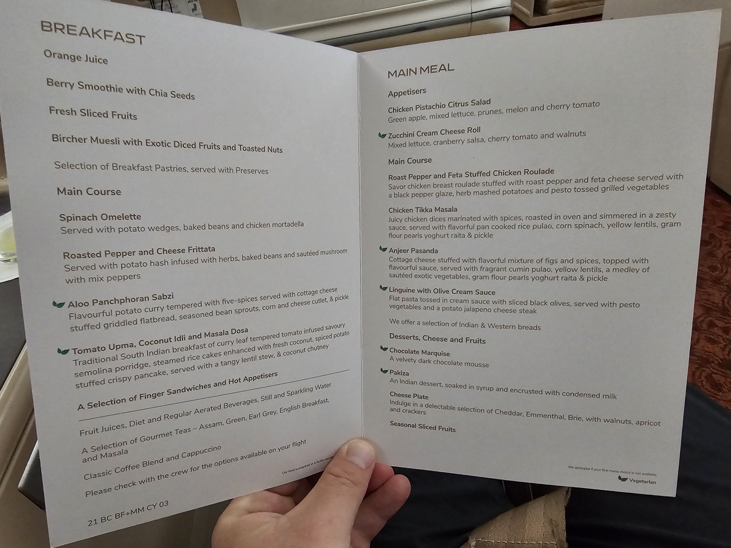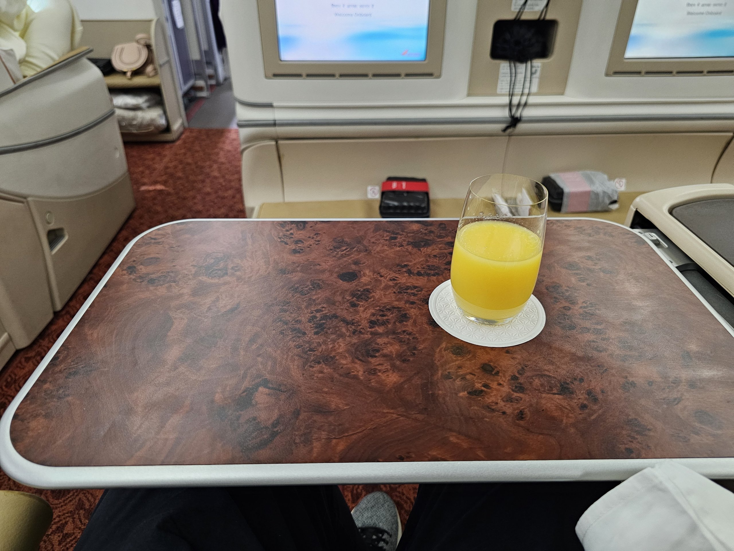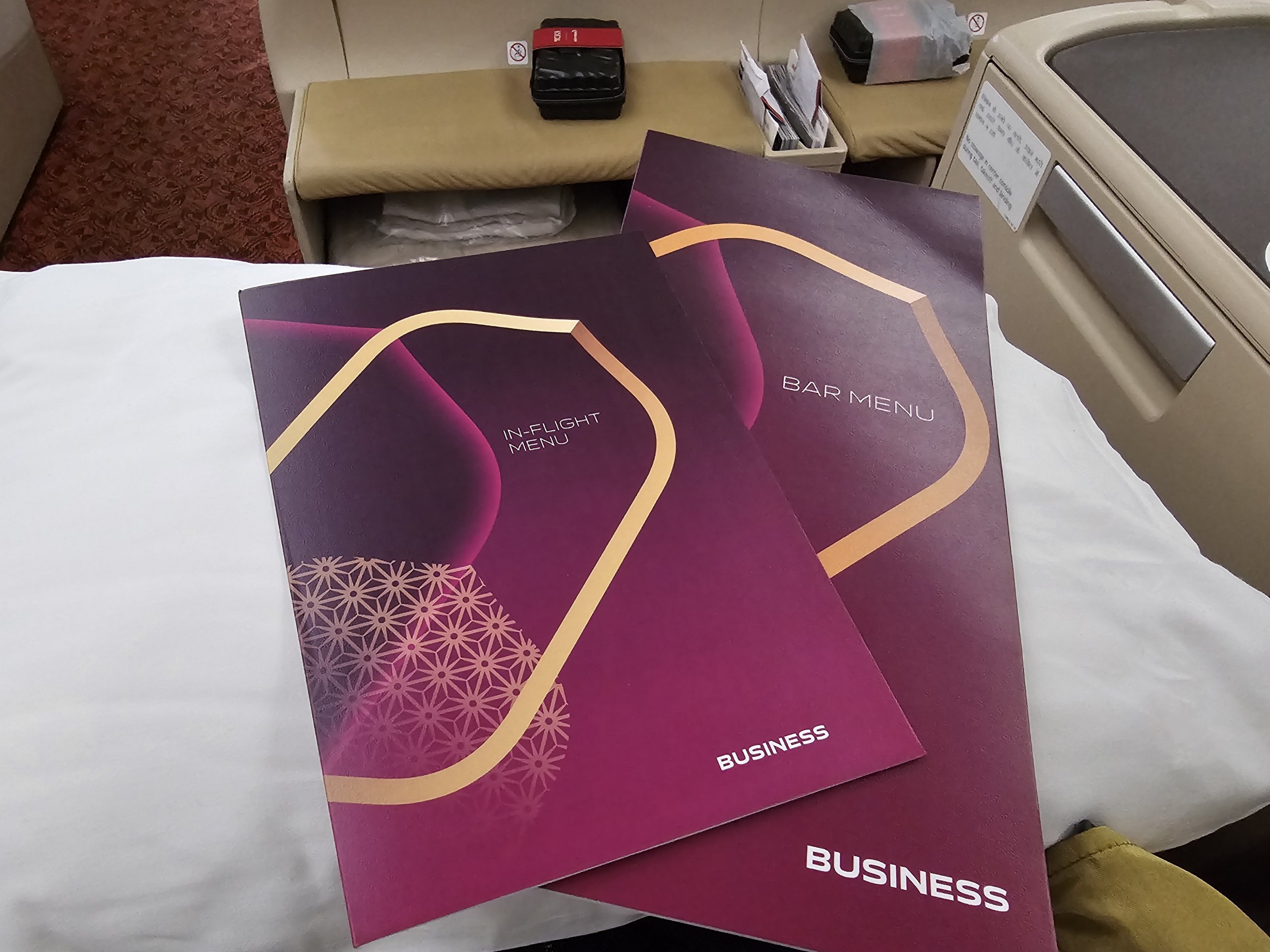 Iškart po įlaipinimo kiekvienam keleiviui siūlomas sveikinimo gėrimas (apelsinų sultys, granatų sultys, vanduo, šampanas arba pieno masala). Jums duodamas karštas arba šaltas rankšluostis rankoms ir veidui nusišluostyti.