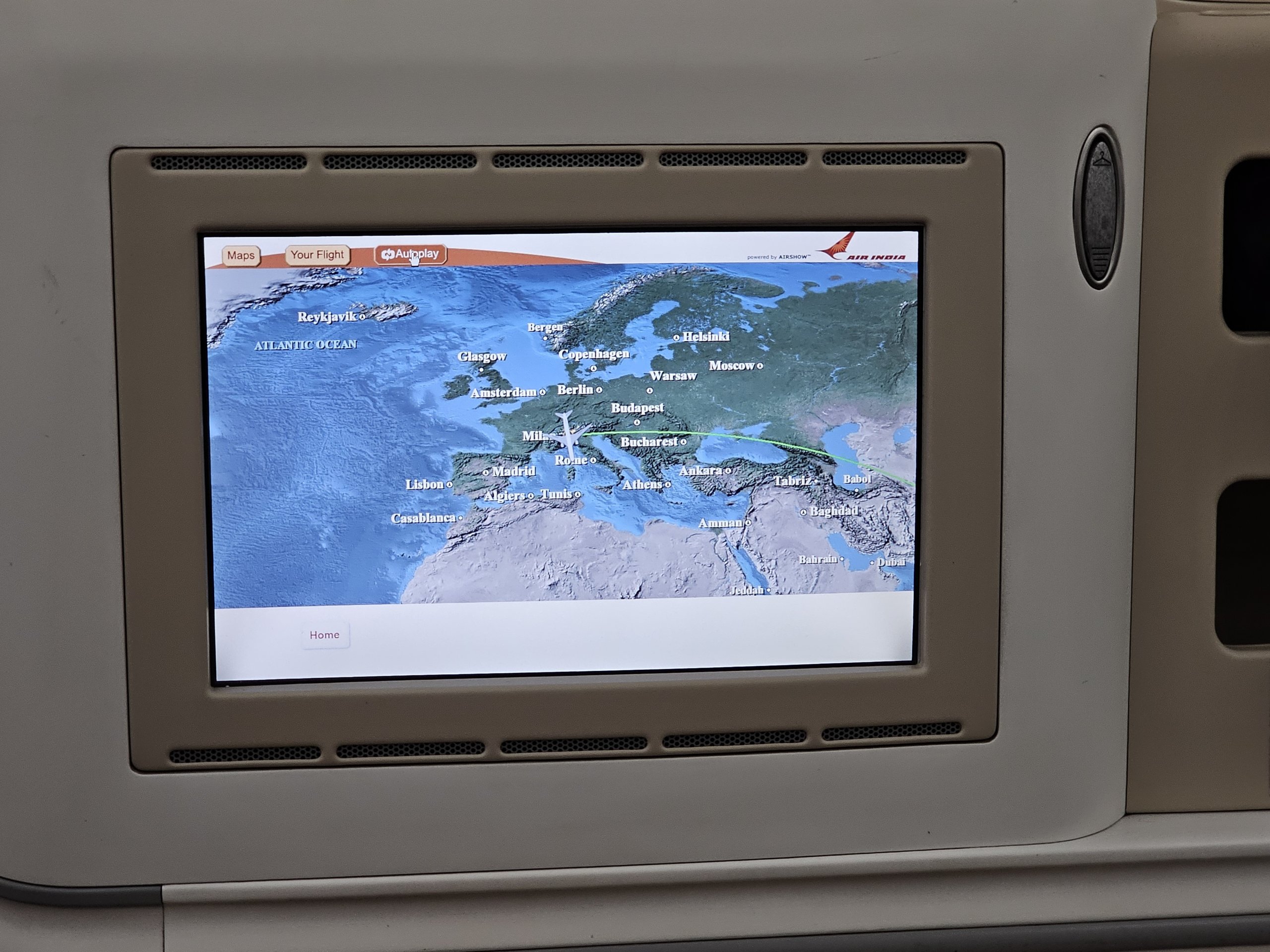 Ji "Air India" lėktuve "Boeing 787-8" yra tikrai priešistorinė. Ekranai nėra didelės raiškos ir, kiek pastebėjome, visuose skrydžiuose bent vieno keleivio IFE apskritai neveikė.