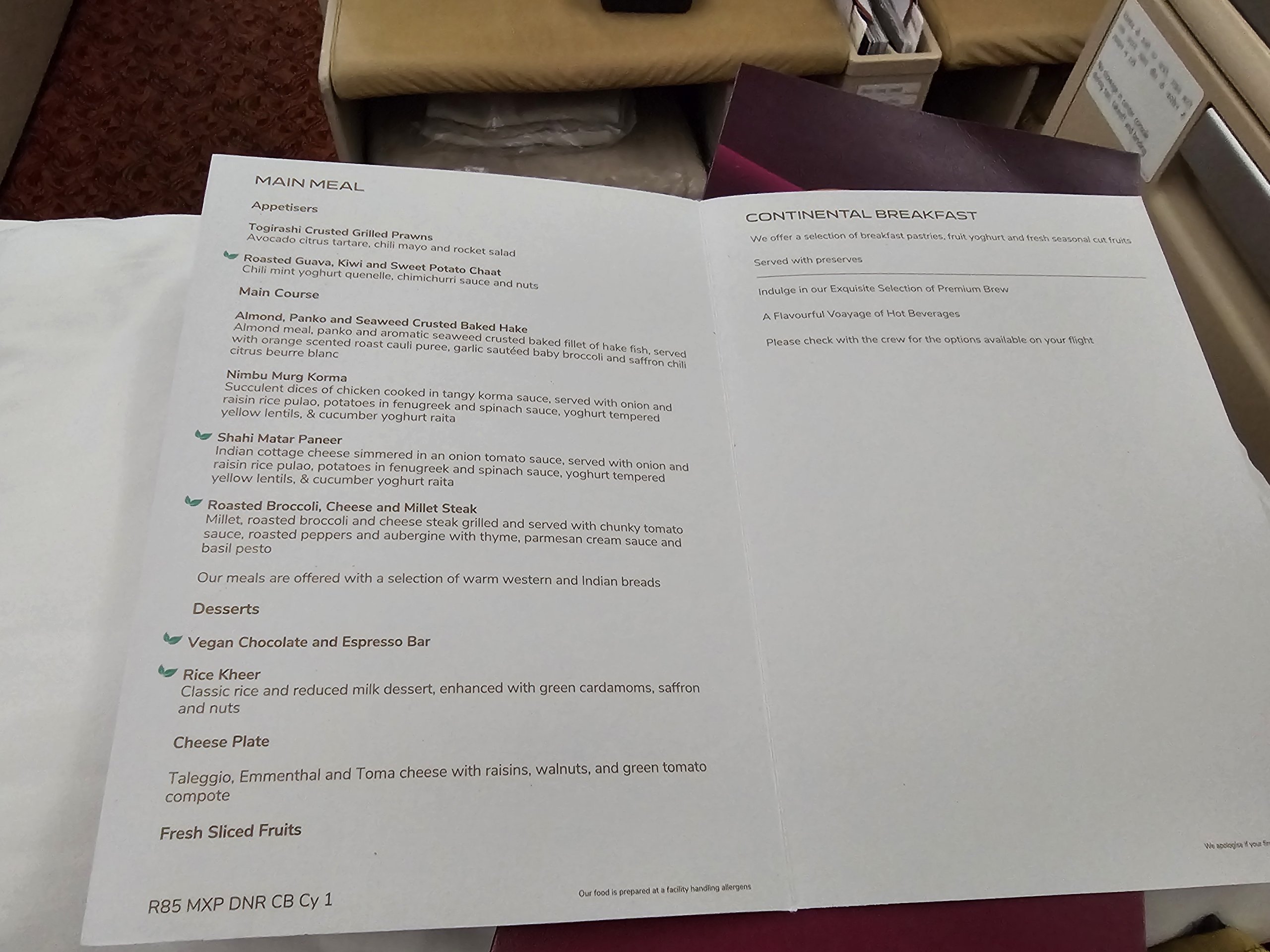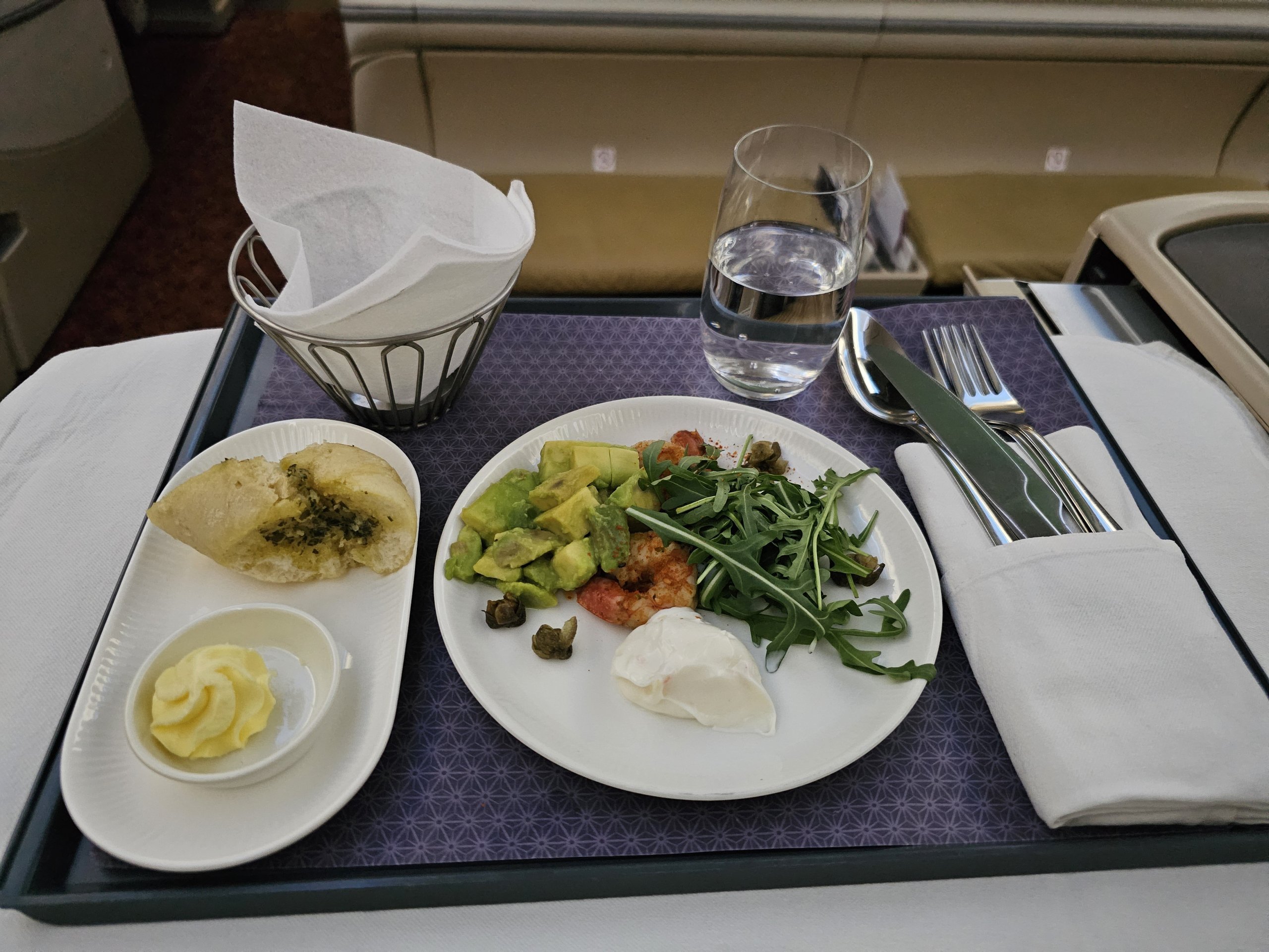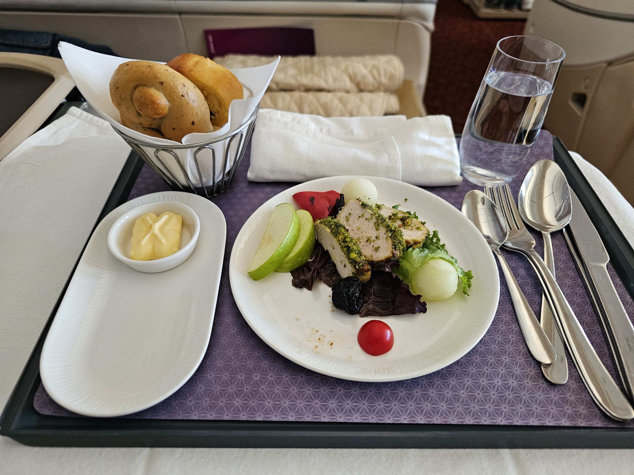 Vėlgi, iš viso yra trys paslaugos - pagrindinis patiekalas iškart po pakilimo, nedidelis karštas užkandis skrydžio viduryje miegui ir pusryčiai prieš nusileidimą.
