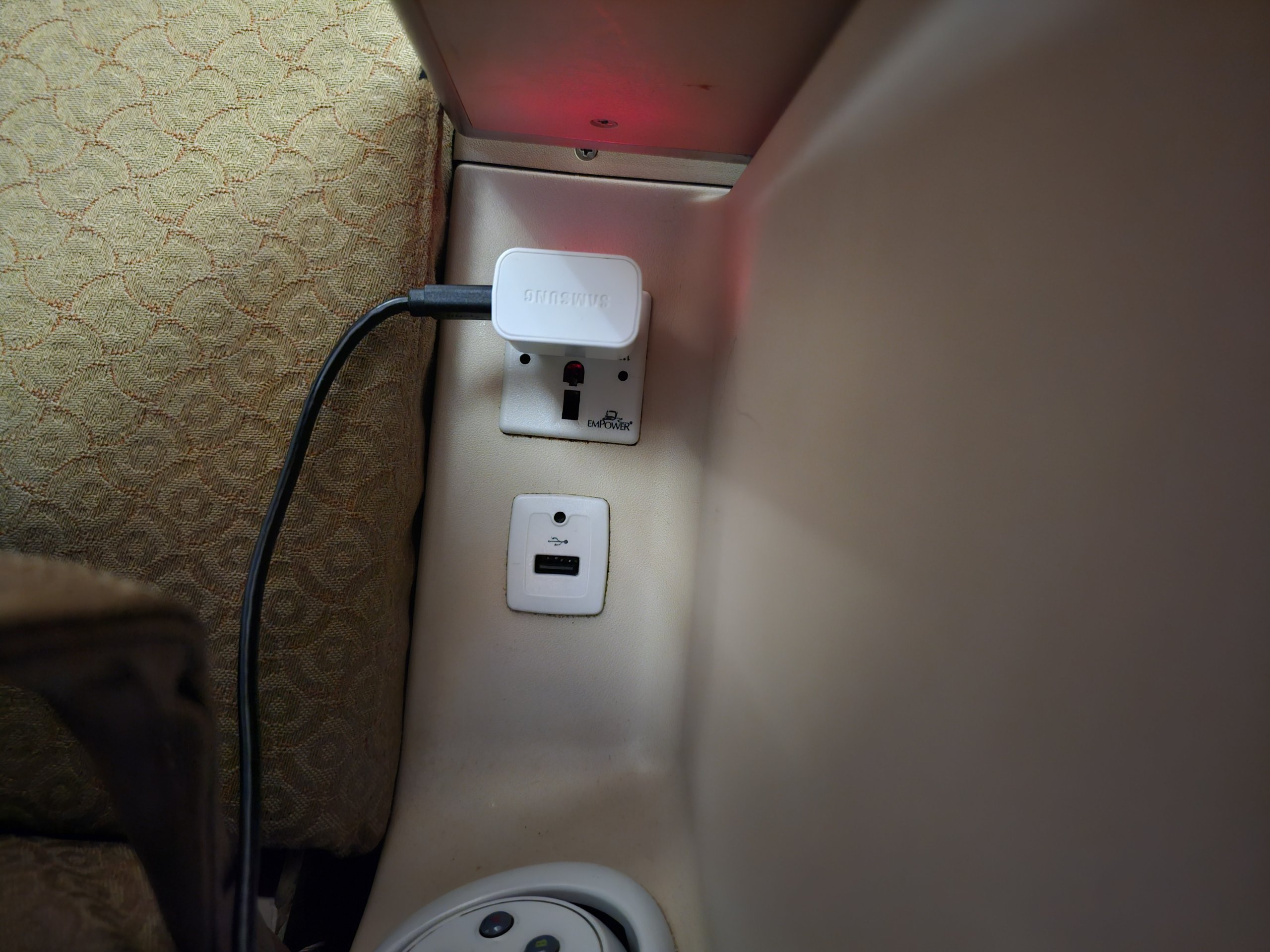 Kiekvienoje sėdynėje taip pat įrengtas tarptautinis universalus kištukinis lizdas. Tačiau pasikliauti, kad jis veiks, nėra gerai. Iš 4 skrydžių prie mano sėdynės esantis kištukas veikė tik du kartus.