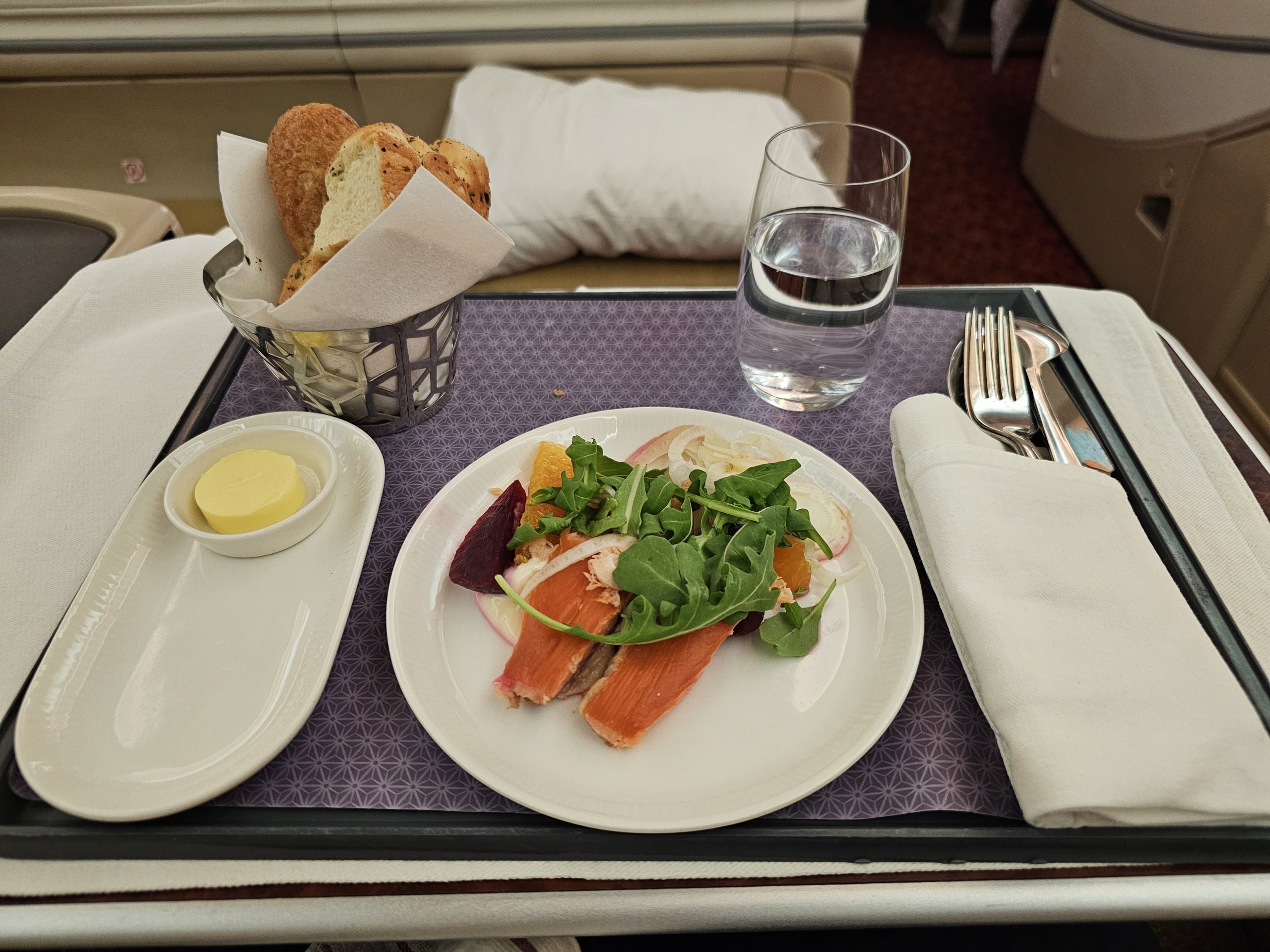 Pradedame pagrindiniu patiekalu, o prieš nusileidimą mums patiekiamos salotos ir desertas. Vaisių dubenėlį pasirenkame tik per antrąjį aptarnavimą.
