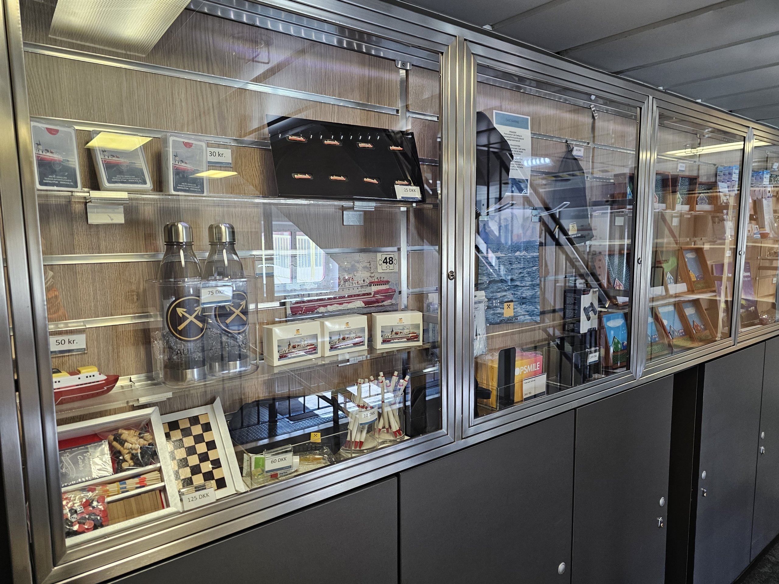 Suvenyrų su "Arctic Umiaq Line" logotipu taip pat galite įsigyti valgykloje. Galite įsigyti rašiklių, kepuraičių ar dėlionių su "Sarfaq Ittuk" atvaizdu.