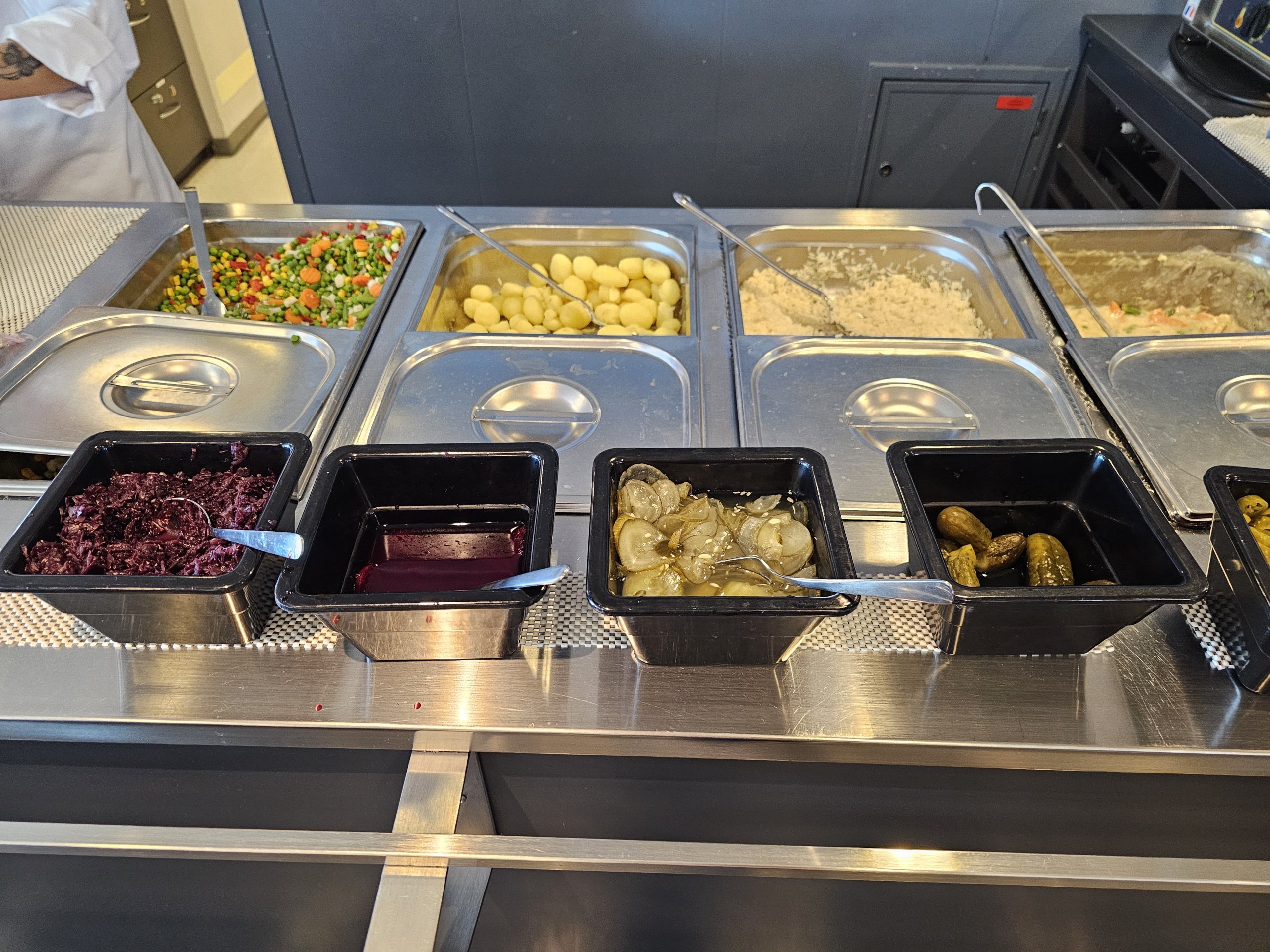 Vakarienės metu taip pat galite pasiimti kitų daržovių, papildomų krevečių ir deserto. Pietums užkandis ir desertas neteikiami.