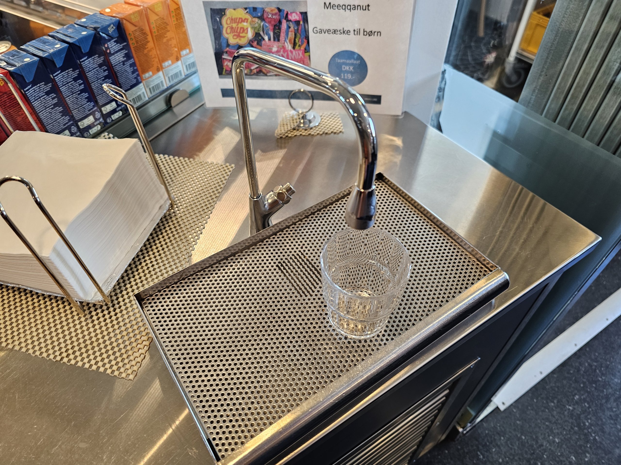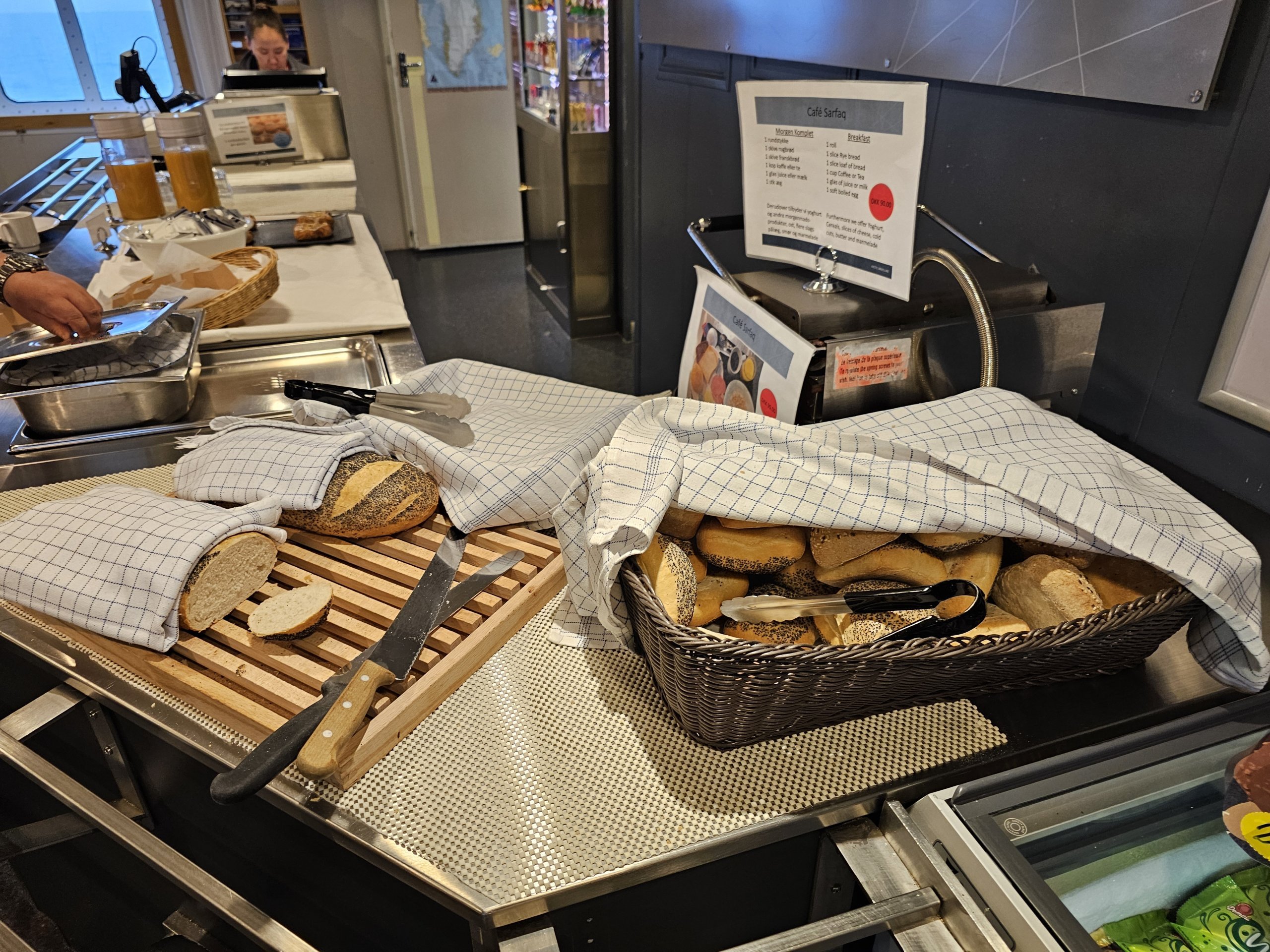 Skanių smørrebrød (atvirų sumuštinių), bagetų, kavos iš automato, saldumynų ir dar daugiau galite nusipirkti kavinėje "Café Sarfaq" bet kuriuo metu nuo 7:00 iki 22:00 val.