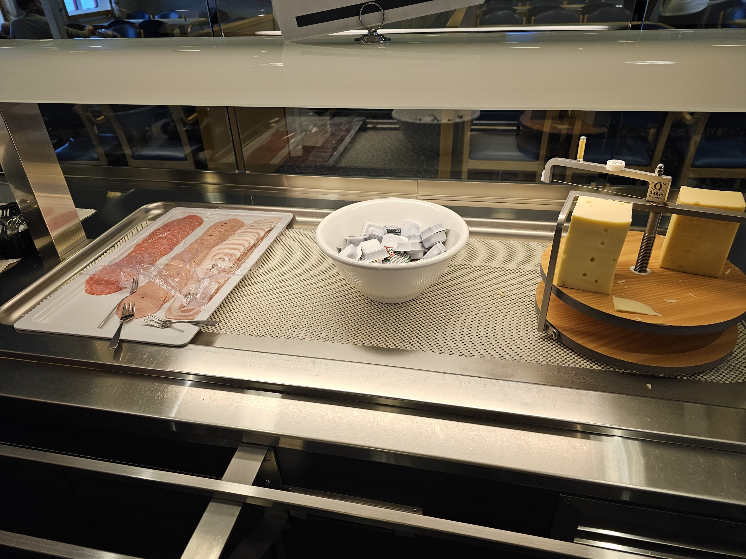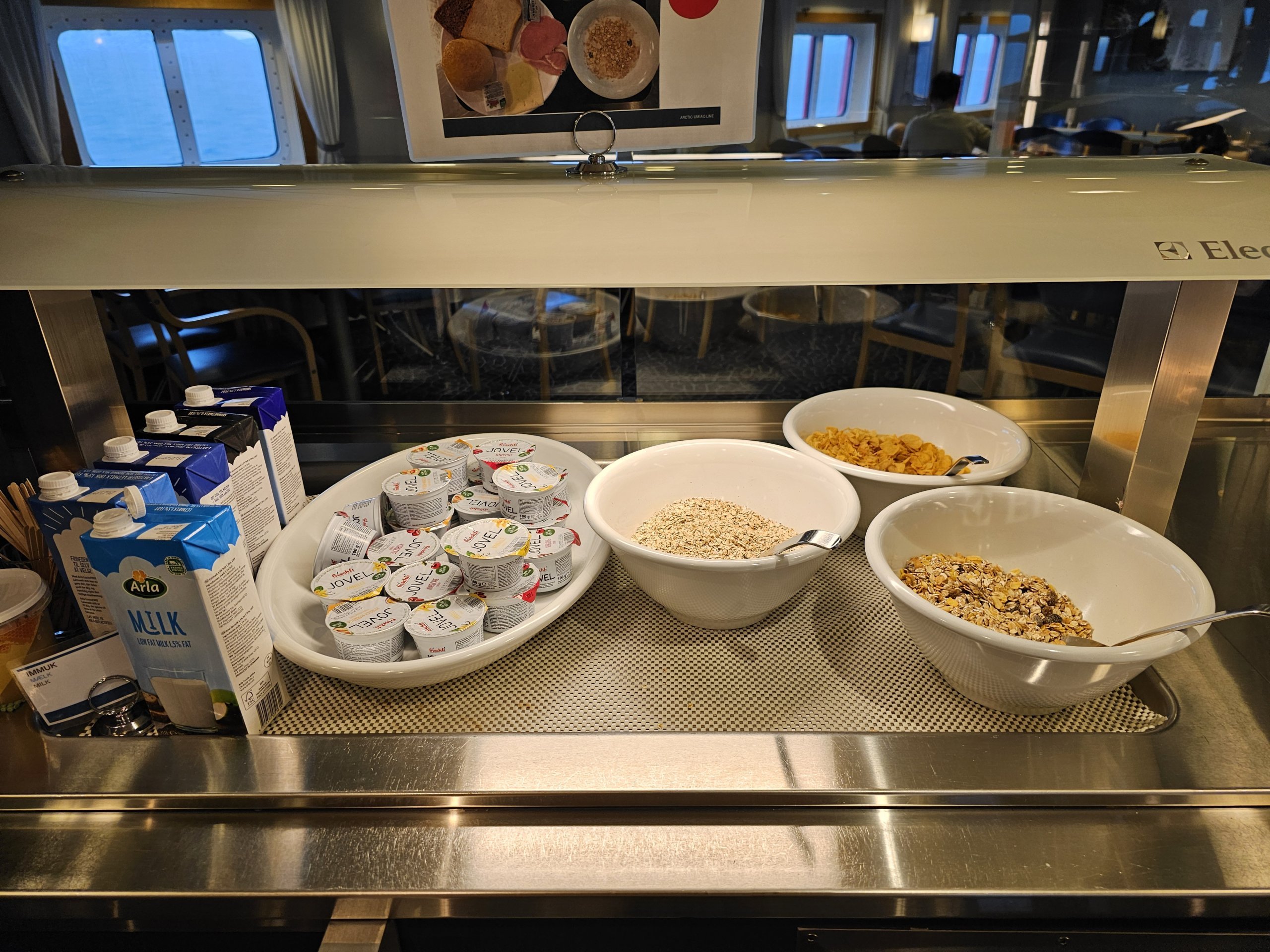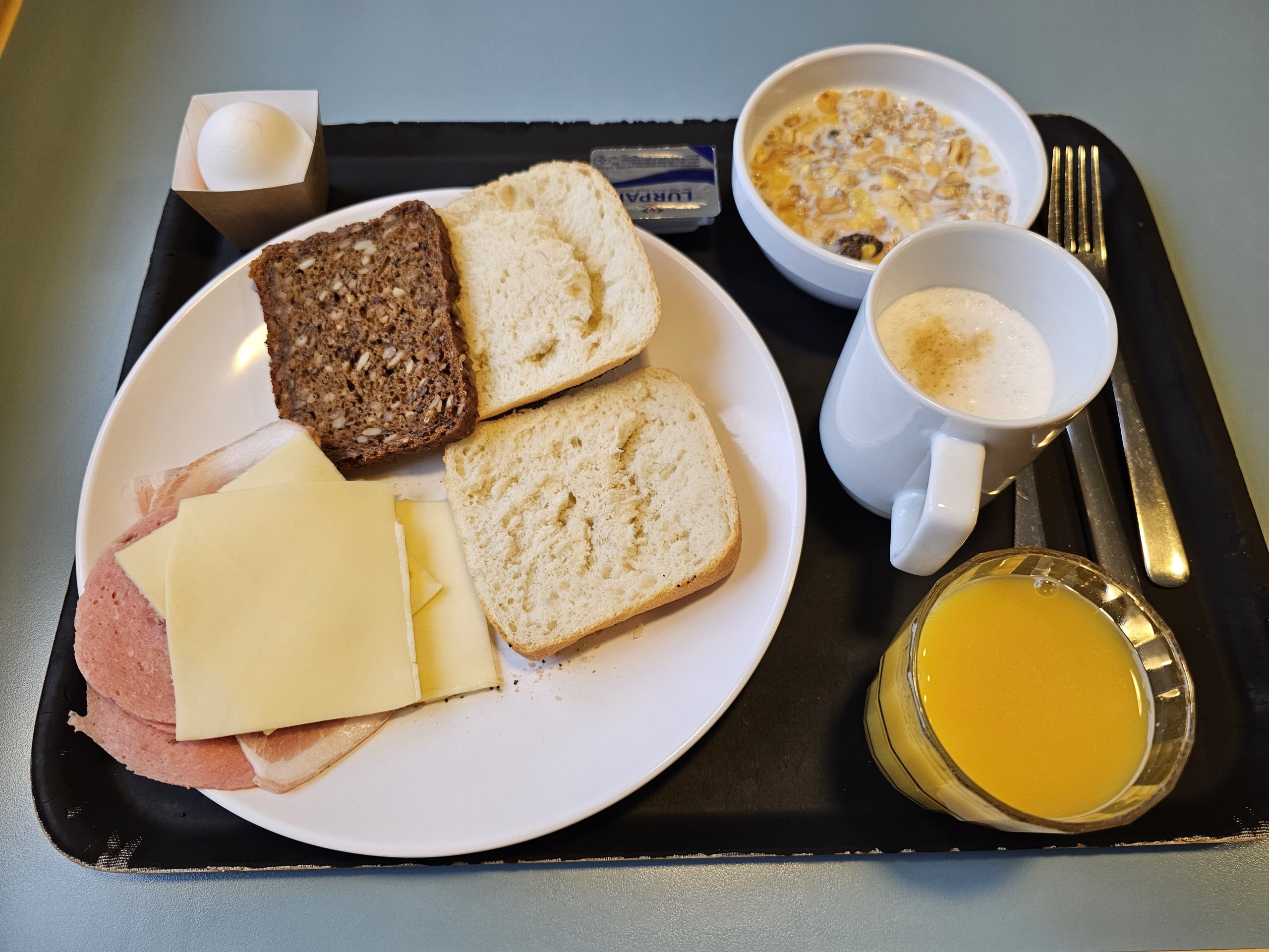 Galite rinktis iš 3 pyragaičių, 1 jogurto, dribsnių, taip pat kelių rūšių sūrio, kumpio ar saliamio, kavos ir sulčių. Pusryčius galite pasiimti tik vieną kartą.