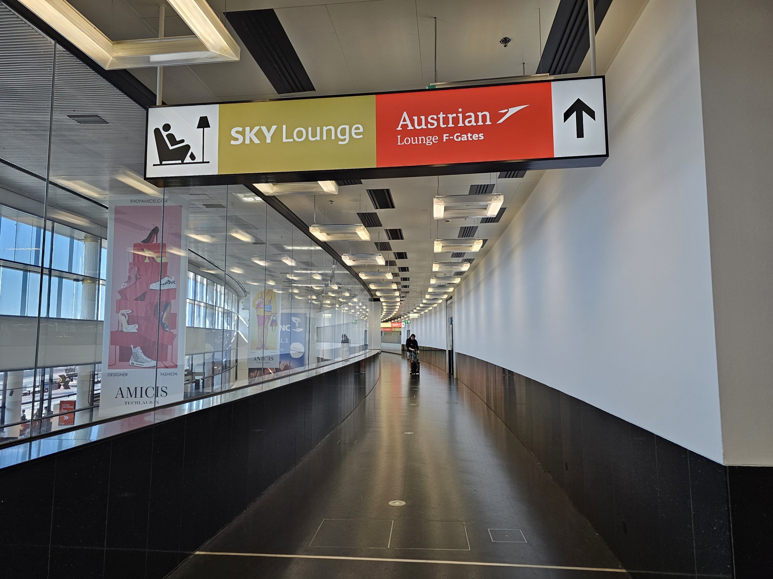 Jei skrendate į Šengeno šalį, iš poilsio kambario eikite vienu aukštu žemyn tiesiai prie "F vartų". Jei skrendate į ne Šengeno šalį, vis tiek turėsite pereiti pasų kontrolę, kuri yra visai šalia salės.