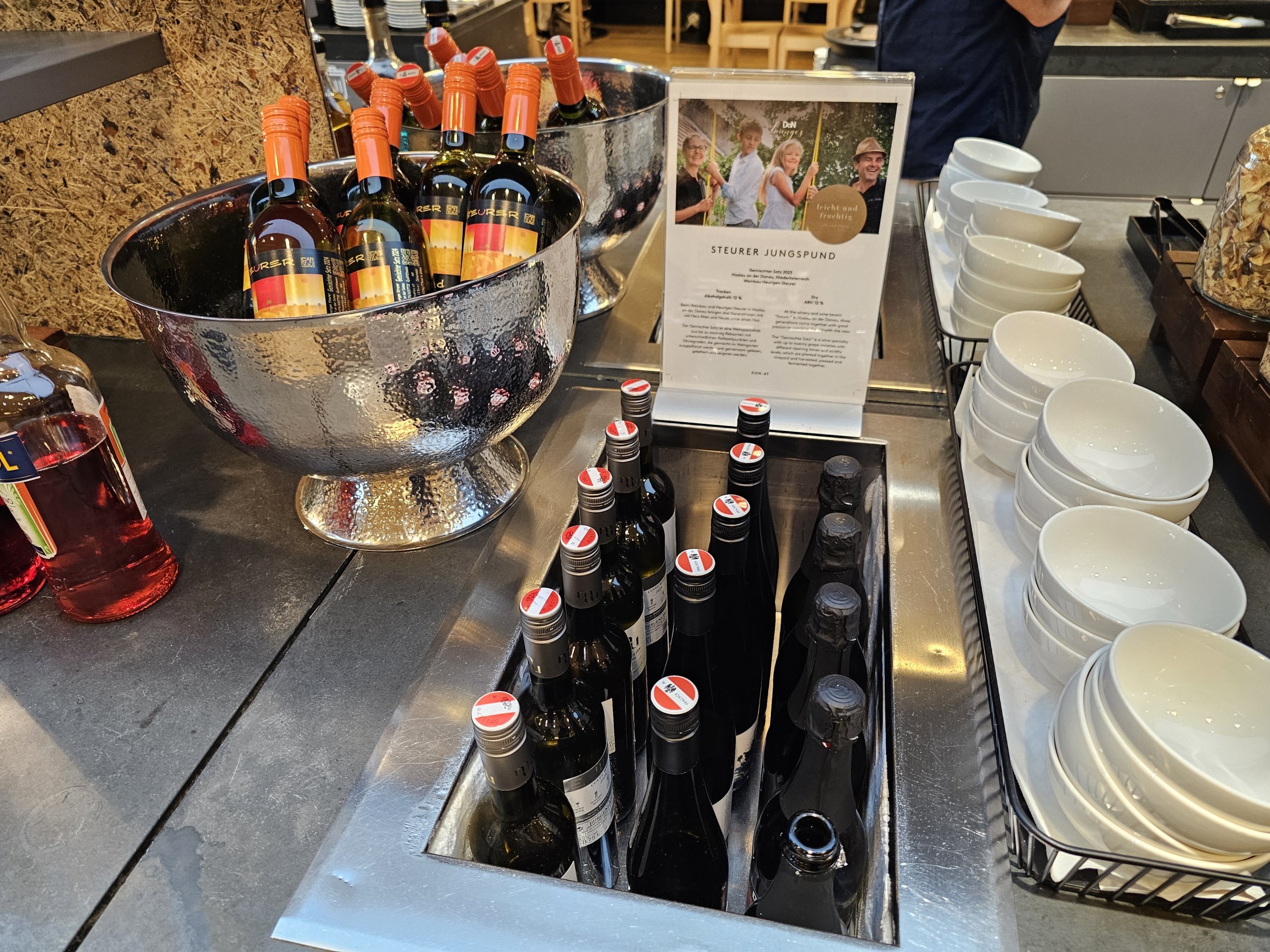 Austrian Lounge salonas yra maloni vieta ne tik greitai užkąsti prieš skrydį, bet ir greitai atlikti darbus prie daugybės darbui su nešiojamuoju kompiuteriu pritaikytų stalų.