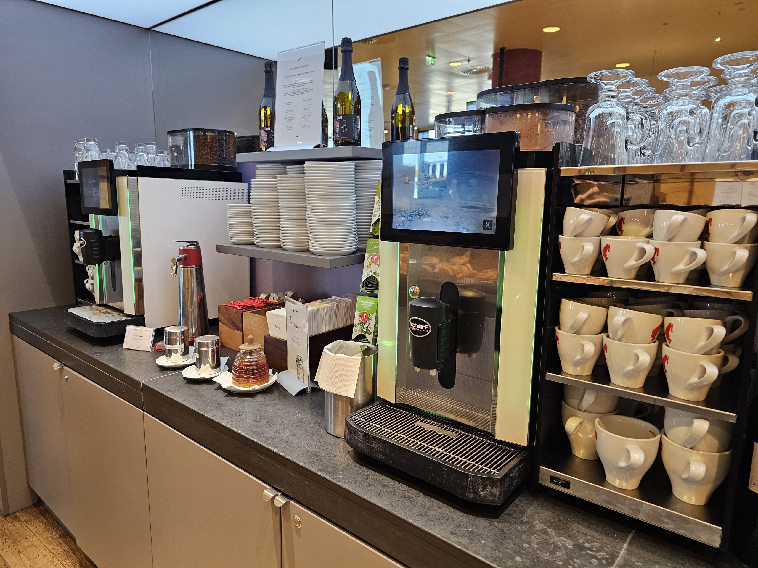 Arbatų pasirinkimas gana silpnas, tačiau medus džiugina. Kavos galima įsigyti tik iš kavos aparatų, todėl ją vertinu vidutiniškai.