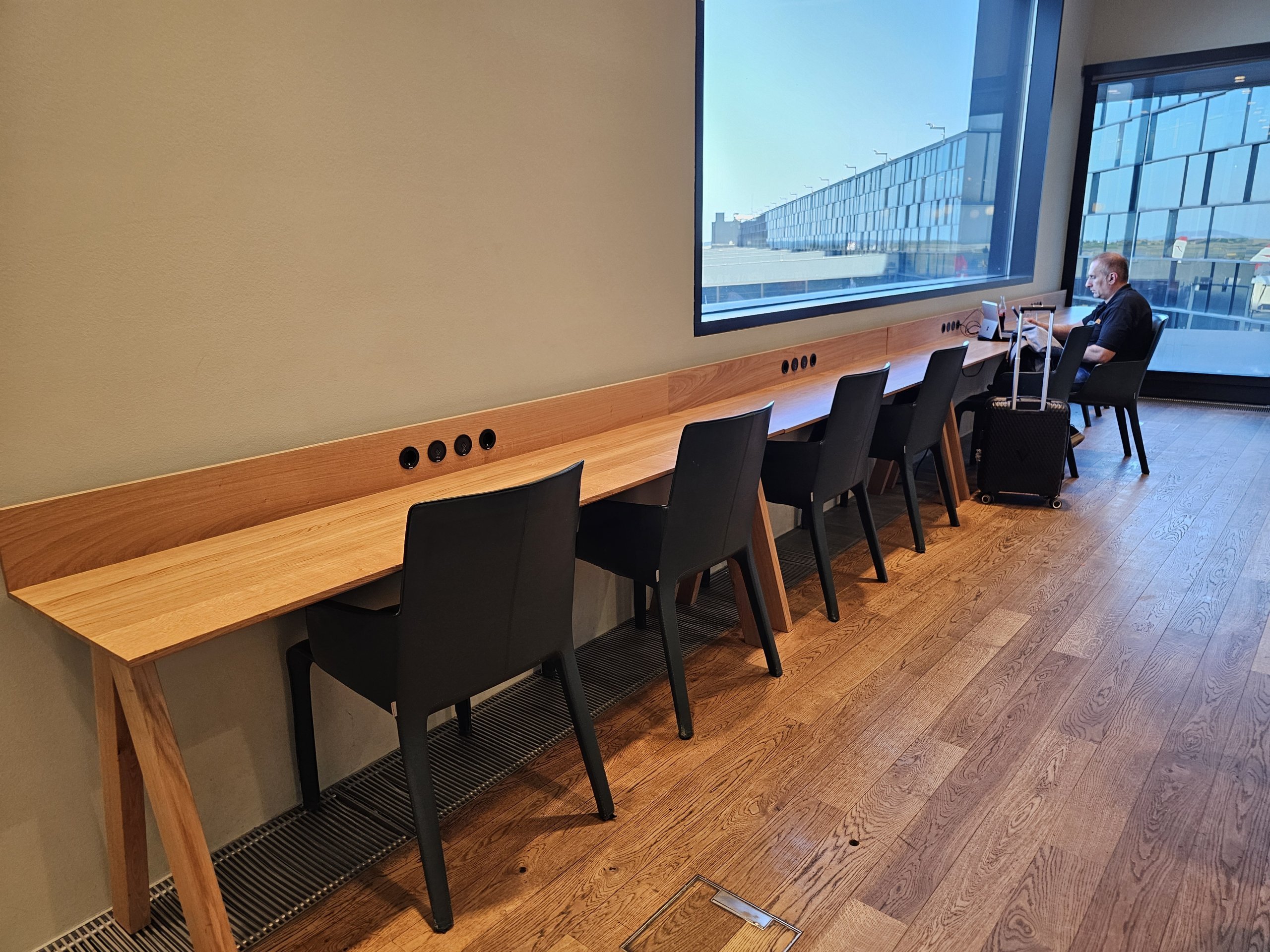 Man tai netrukdo, nes vis tiek planuoju valgyti, o po kurio laiko atsilaisvina ir sėdimos vietos, puikiai tinkančios darbui nešiojamuoju kompiuteriu ir su tikrai gražiu vaizdu į oro uosto peroną (deja, ne tiesiai į kilimo ir tūpimo taką).