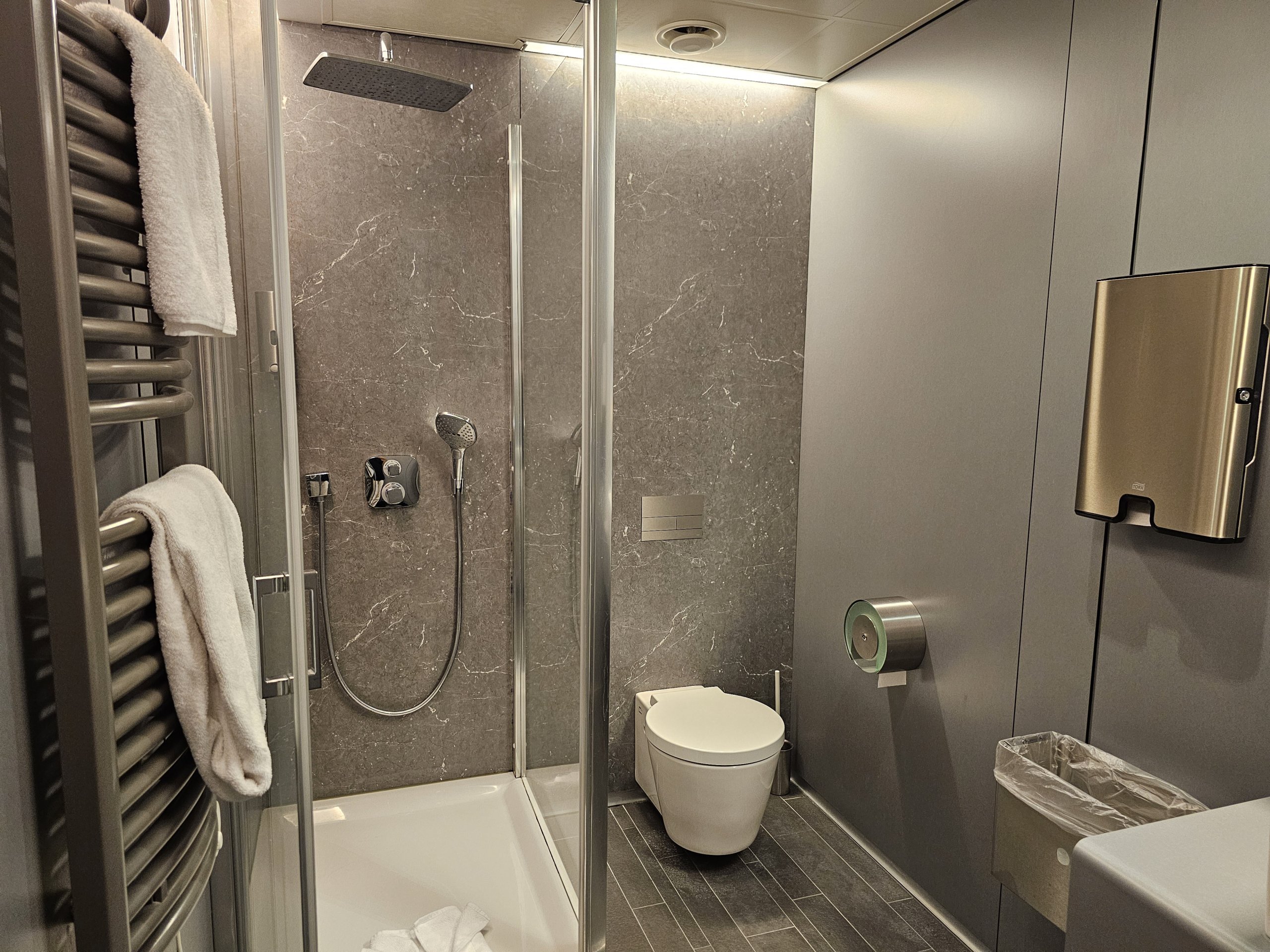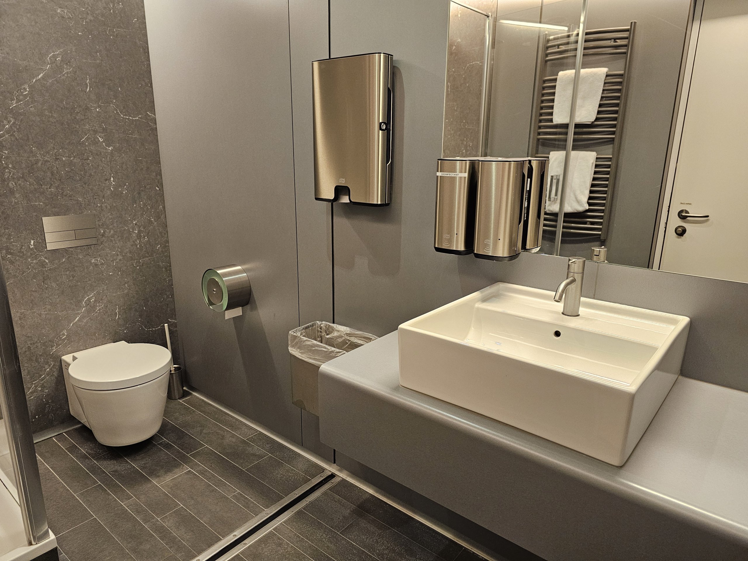 Dušai įrengti visų skyrių - "Senator/Star Alliance Gold", "Business" ir "HON Circle" - bendrojoje erdvėje.