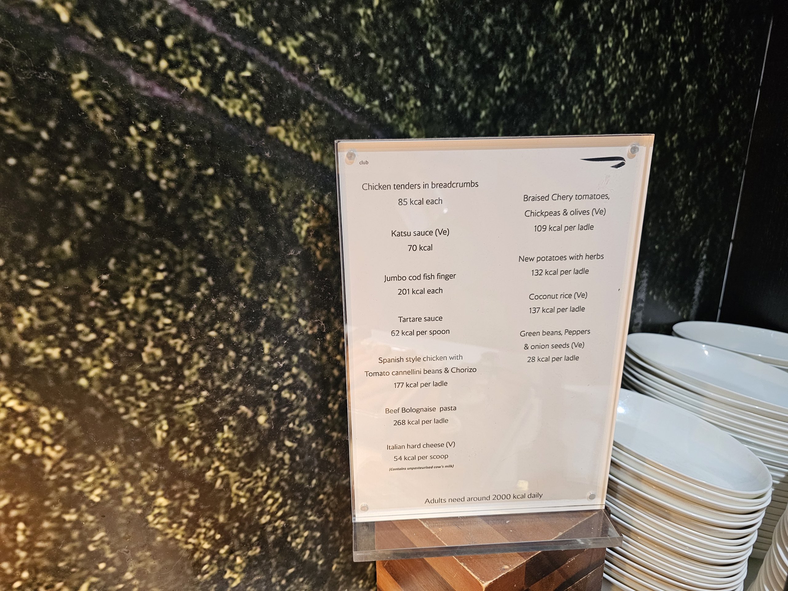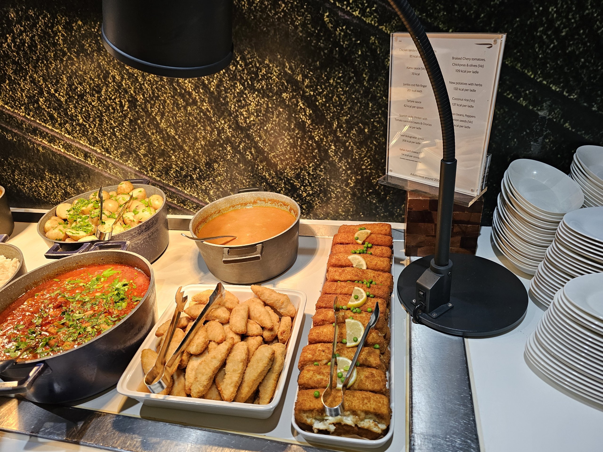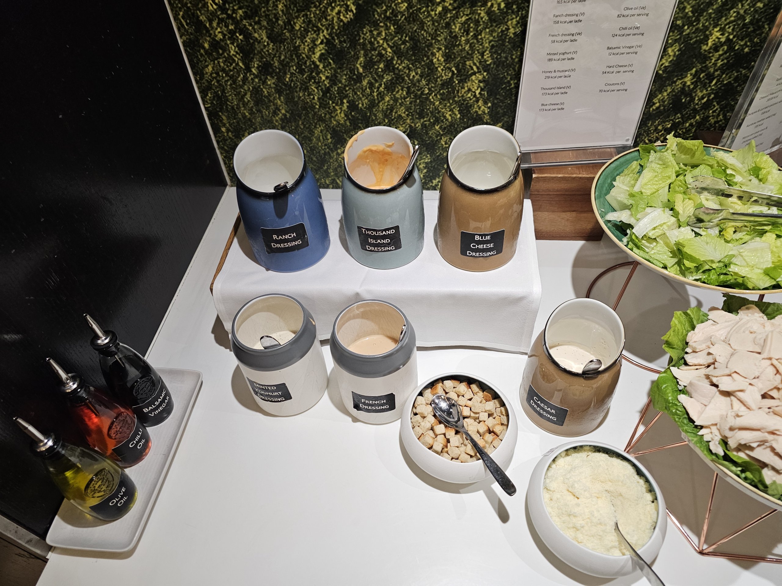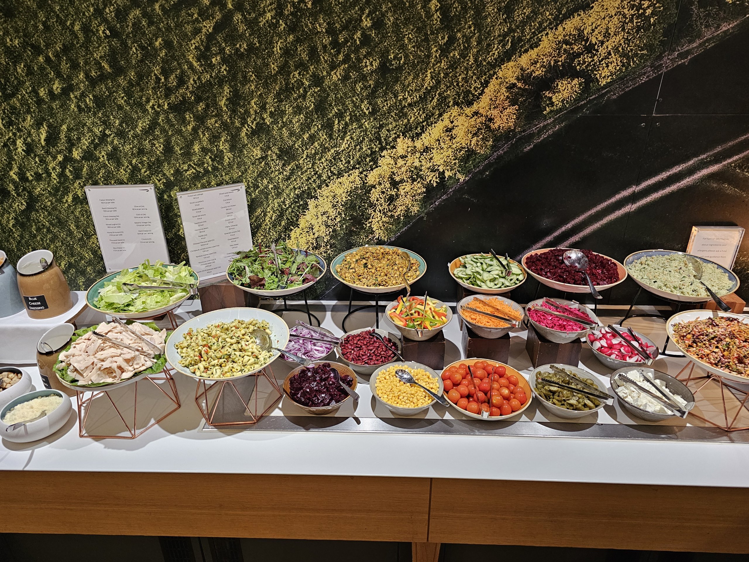 Šaltojo maisto meniu yra kelios daržovės, salotos su įvairių padažų pasirinkimu ir labai ribotas ir silpnas kepinių pasirinkimas (praktiškai tik saldūs).