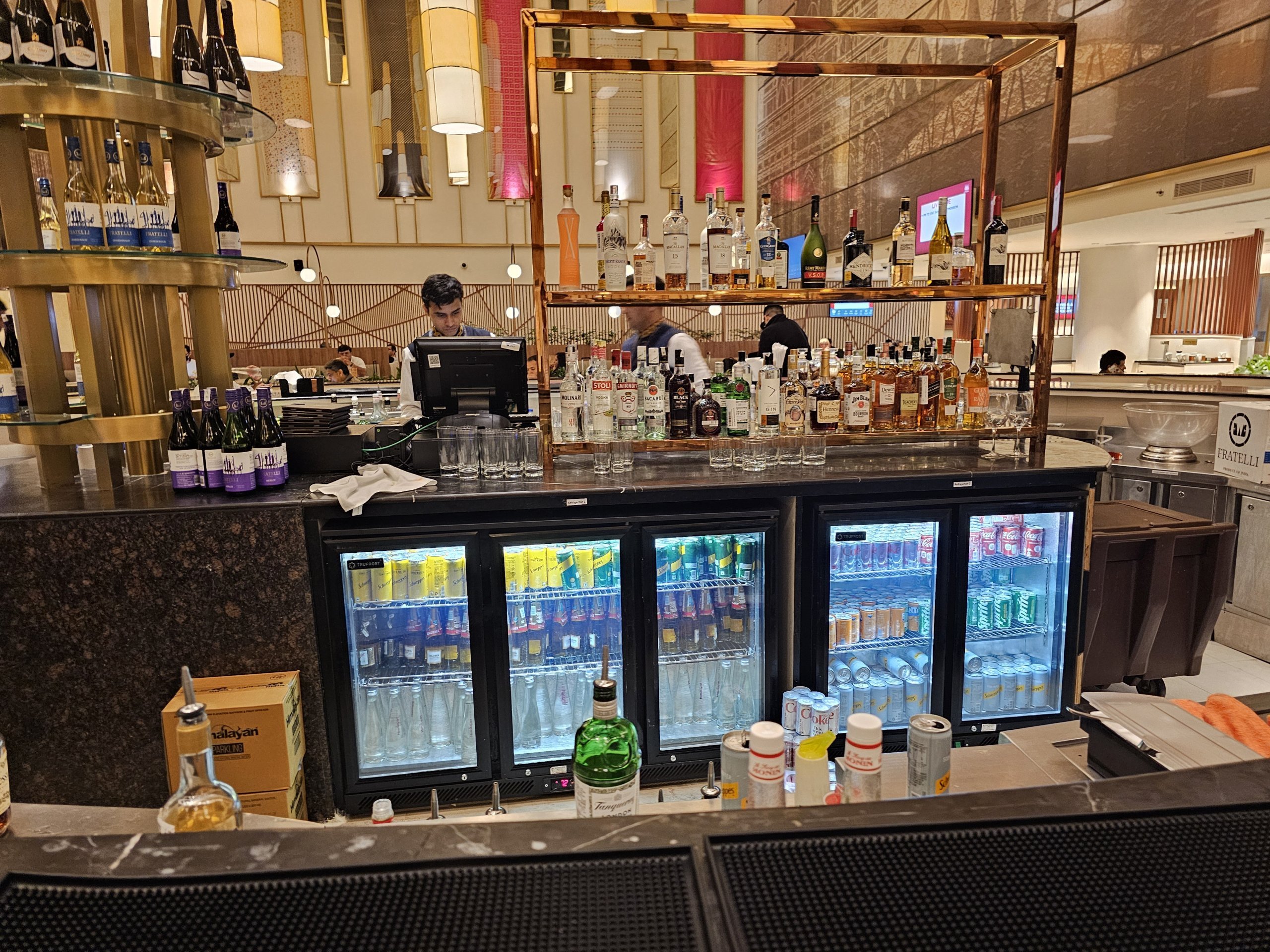 Kokteilių, alaus ir kitų alkoholinių gėrimų galima įsigyti centre esančiame bare. Alkoholį visada patiekia tik barmenas.