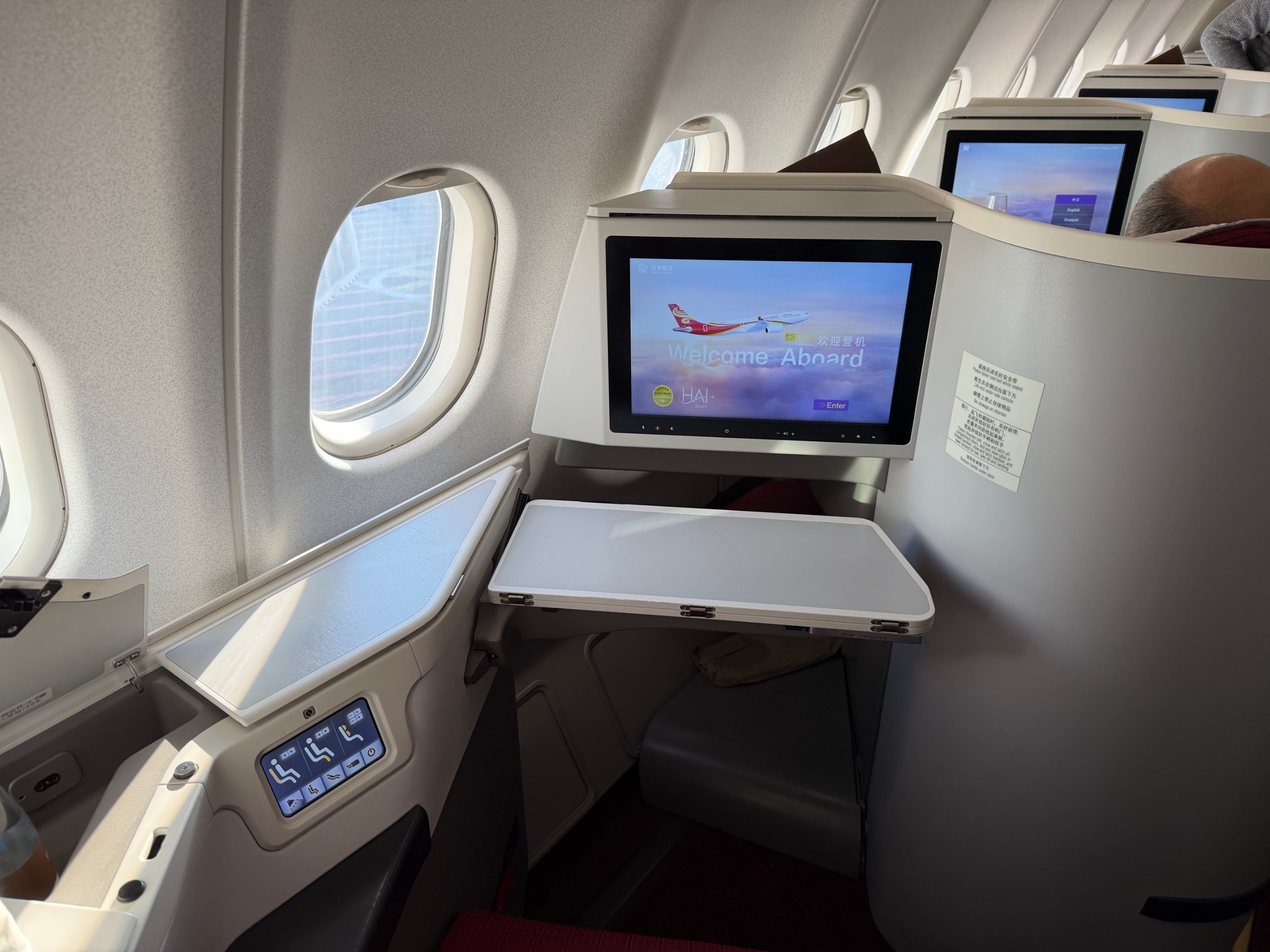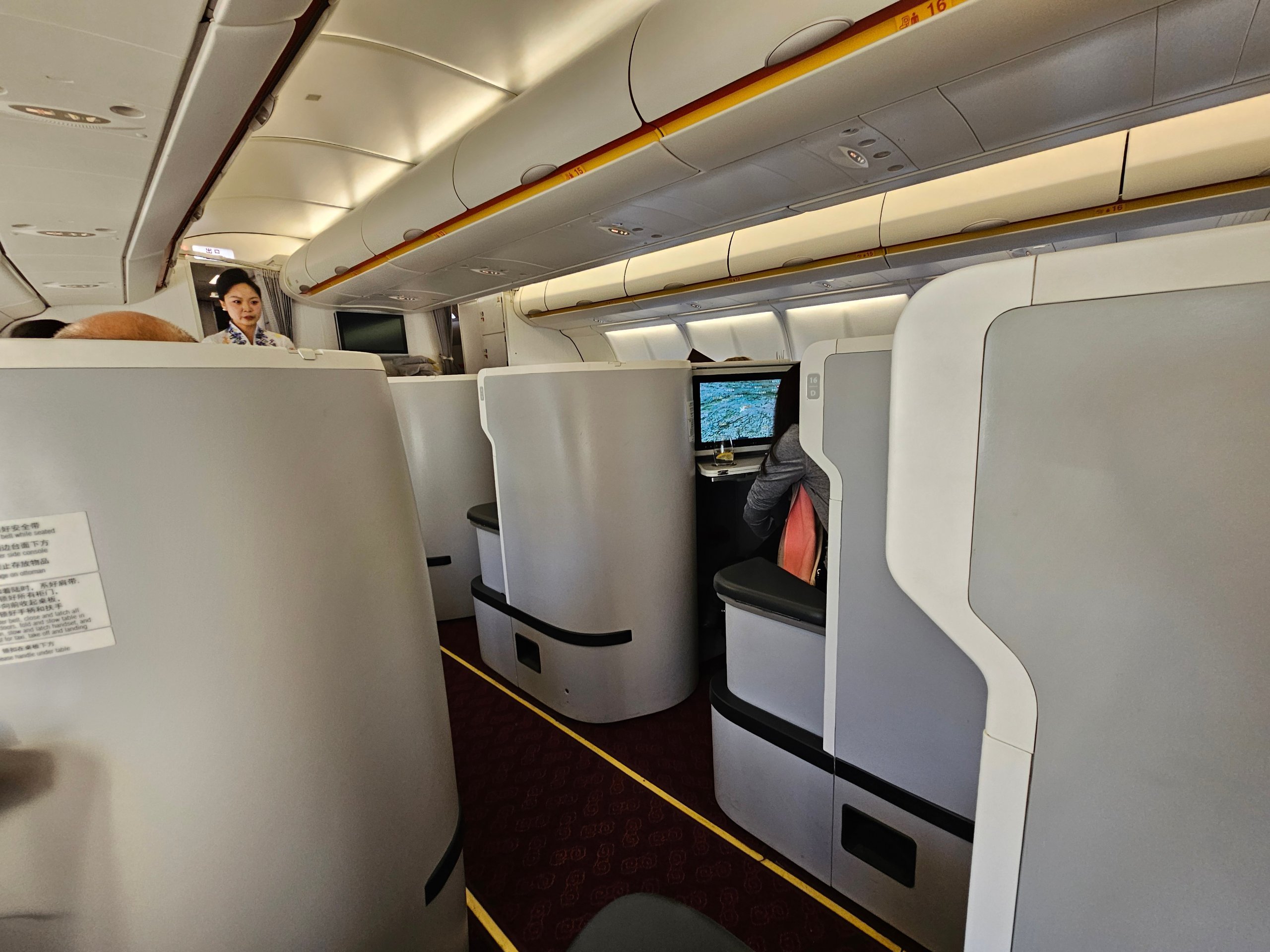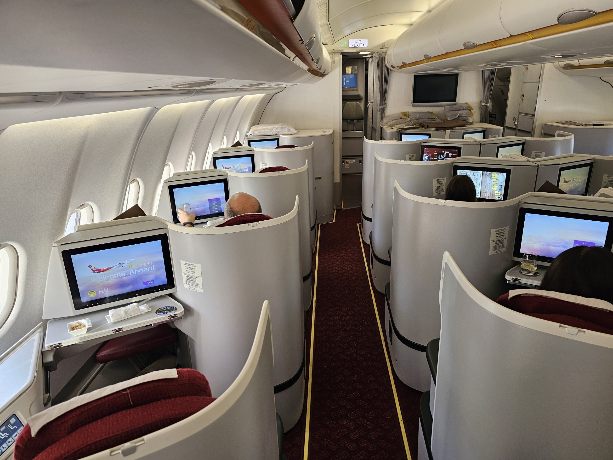 "Hainan Airlines" "Airbus A330-300" verslo klasės lėktuve užtikrinamas geras privatumas ir visiškai plokščia lova. Tai yra pagrindiniai dalykai, kurie lemia skirtumą 10 valandų skrydžio metu.