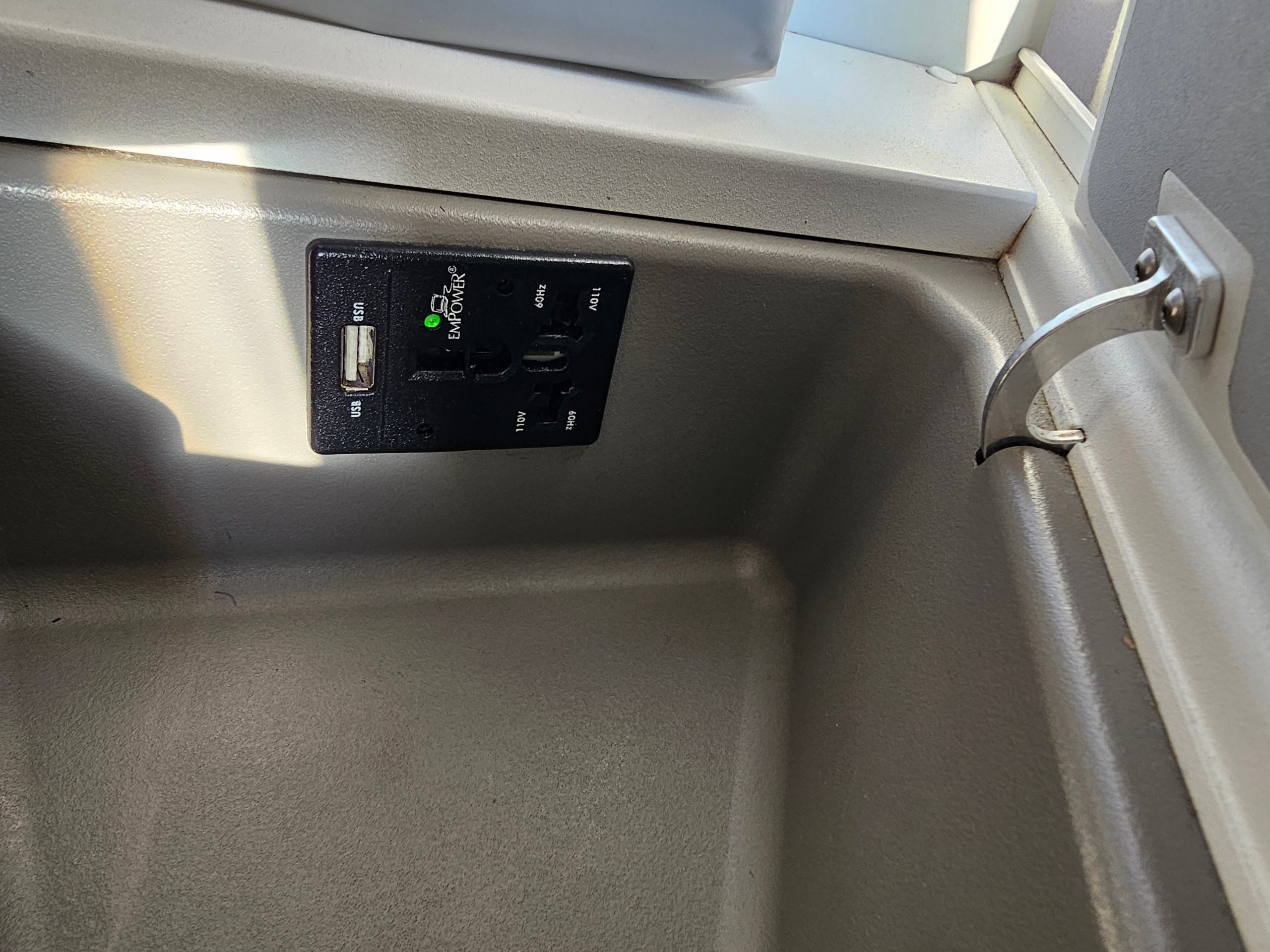 Sėdynės valdymas paprastas - per senesnį, bet funkcionalų jutiklinį ekraną kairėje pusėje. Taip pat yra nedidelė skaitymo lempa ir universalus maitinimo lizdas su USB-A jungtimi.