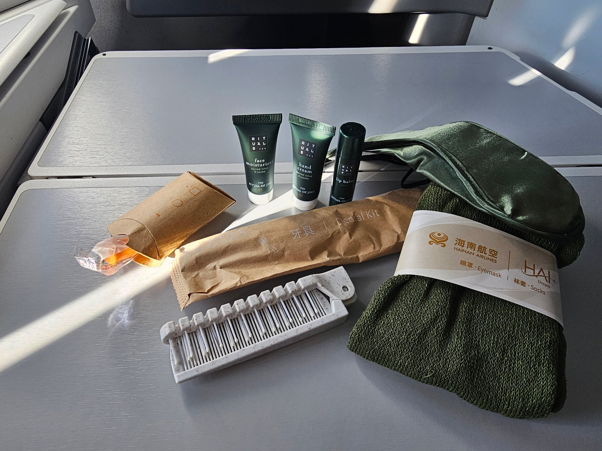 Turinys standartinis: akių kaukė, kojinės, dantų šepetėlis, "Rituals" firminiai reikmenys ir smulkūs daiktai ilgam skrydžiui. Nieko netrūksta, bet niekas ir nestebina.