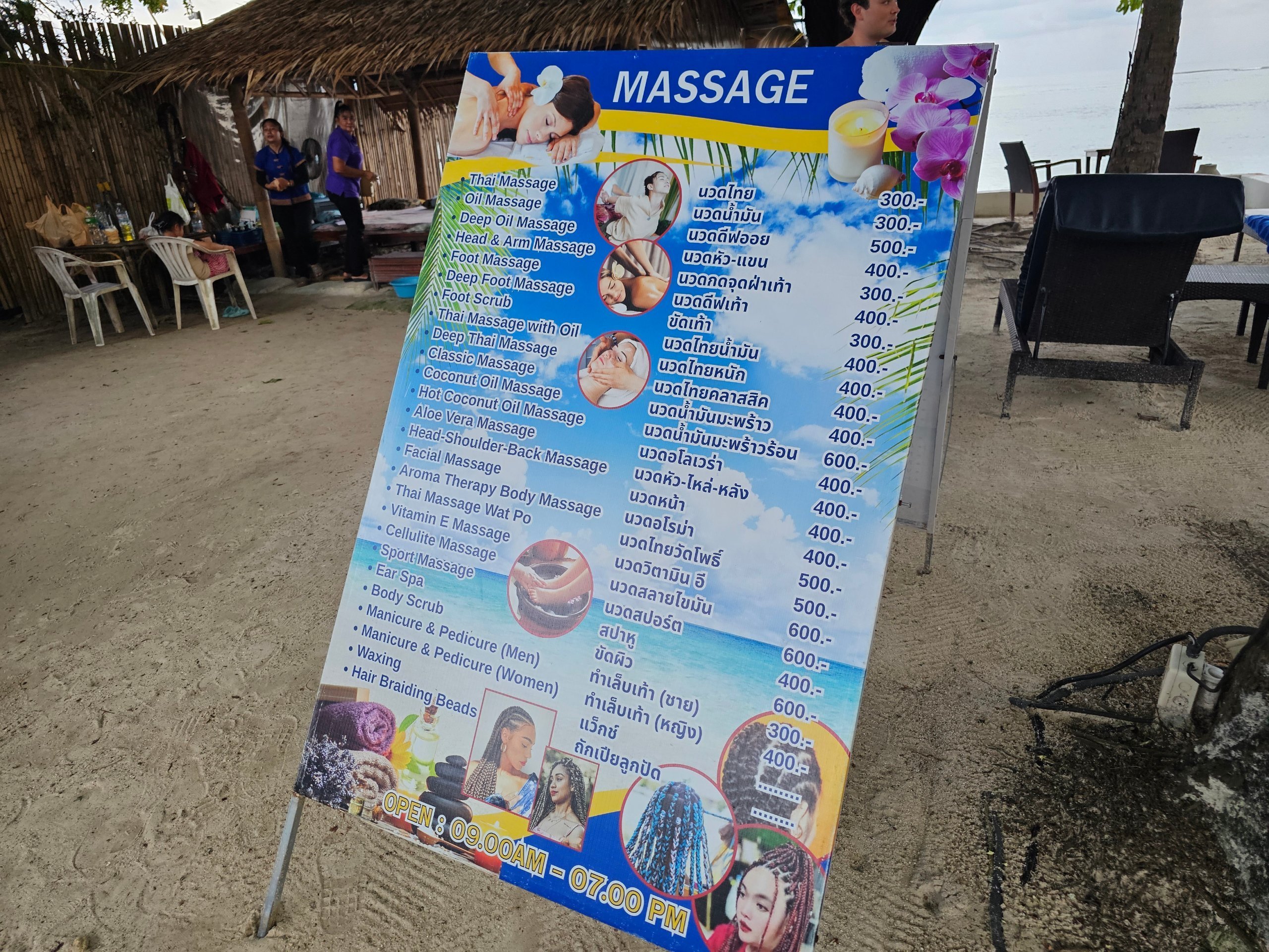 - Masažai - viešbučio paplūdimyje prie baseino, kainos nuo 300 tūkst. tb už 1 val.