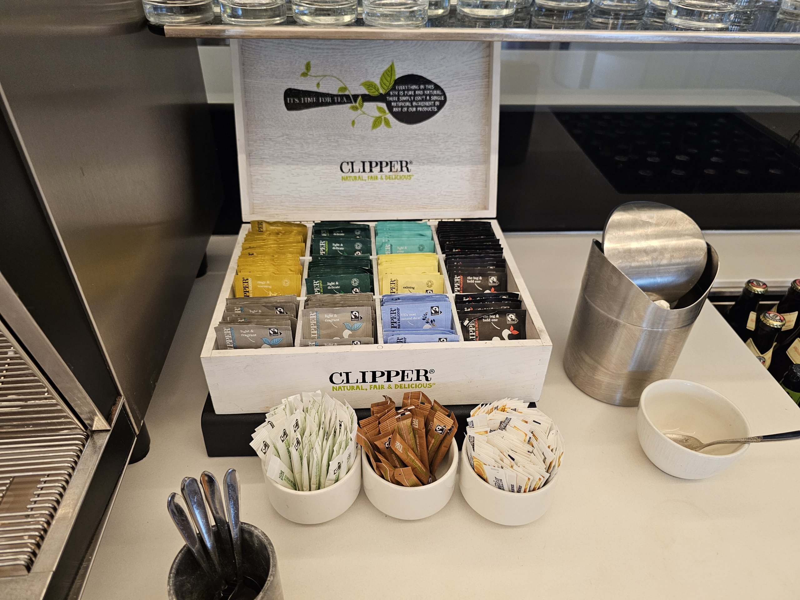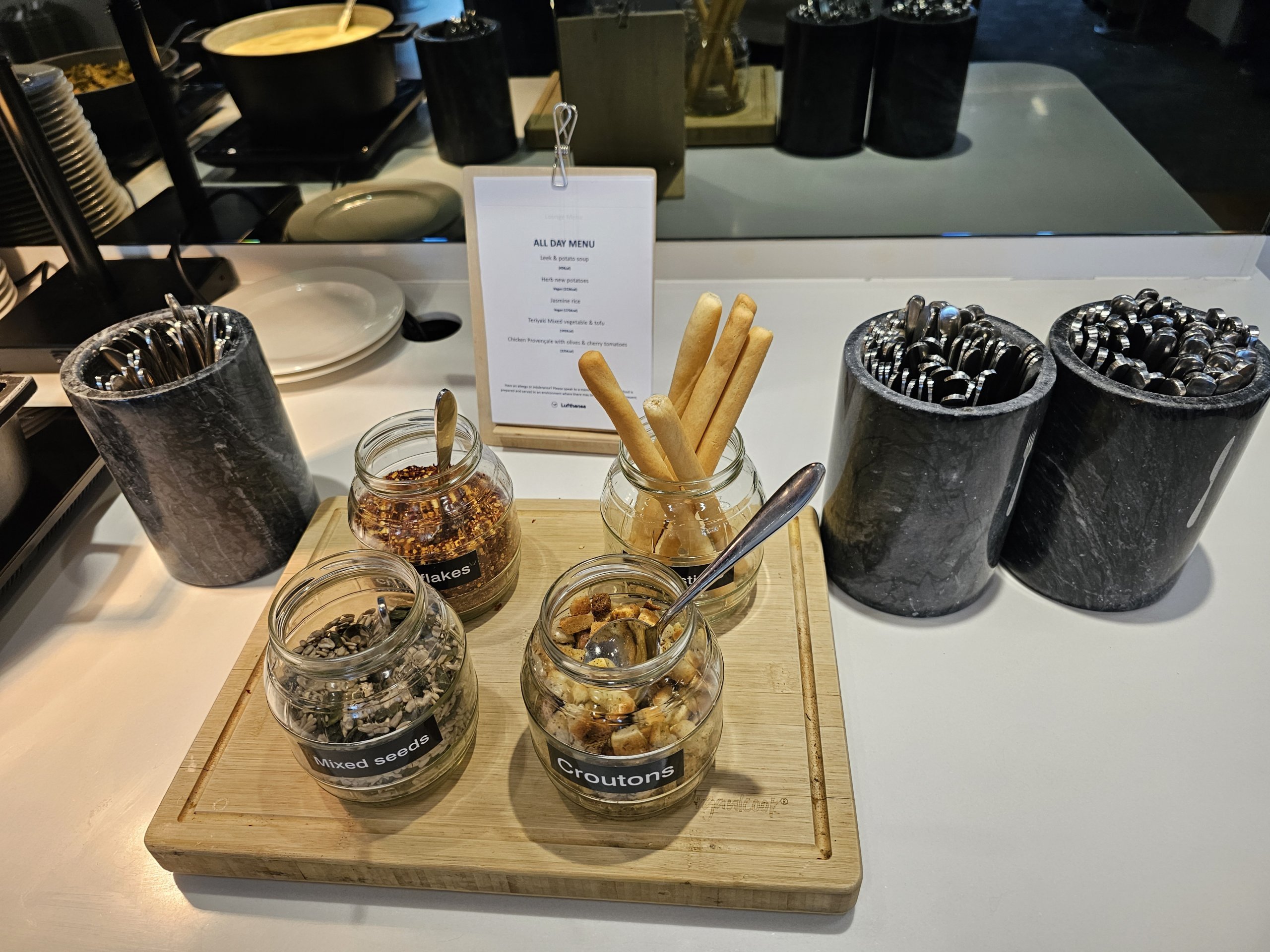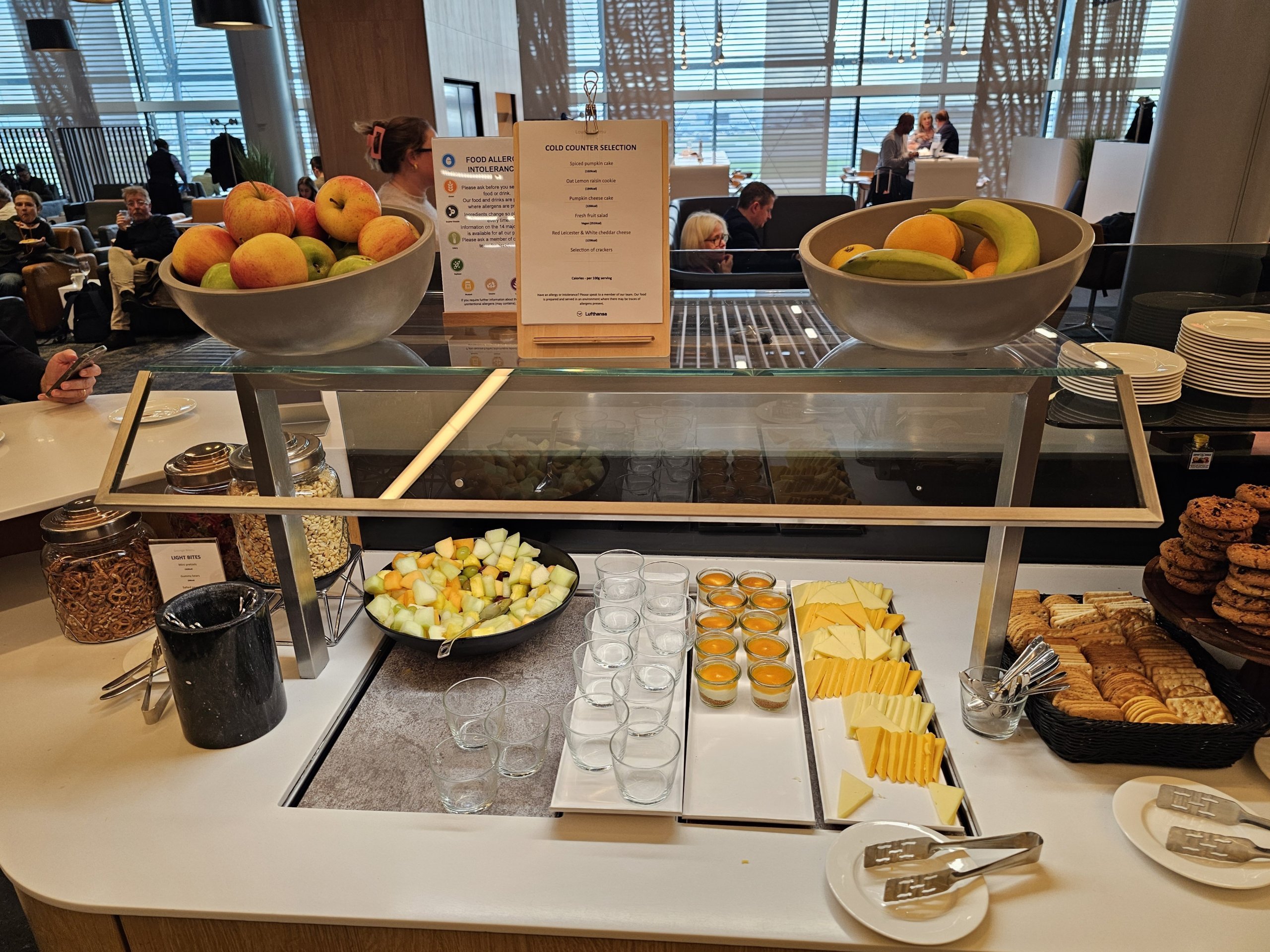 Nors daugelyje oro uostų "Senator Lounge" salėje yra geresnė maisto ir gėrimų pasiūla, Londono "Lufthansa" salėje maistas ir gėrimai verslo ir "Senator Lounge" yra vienodi.