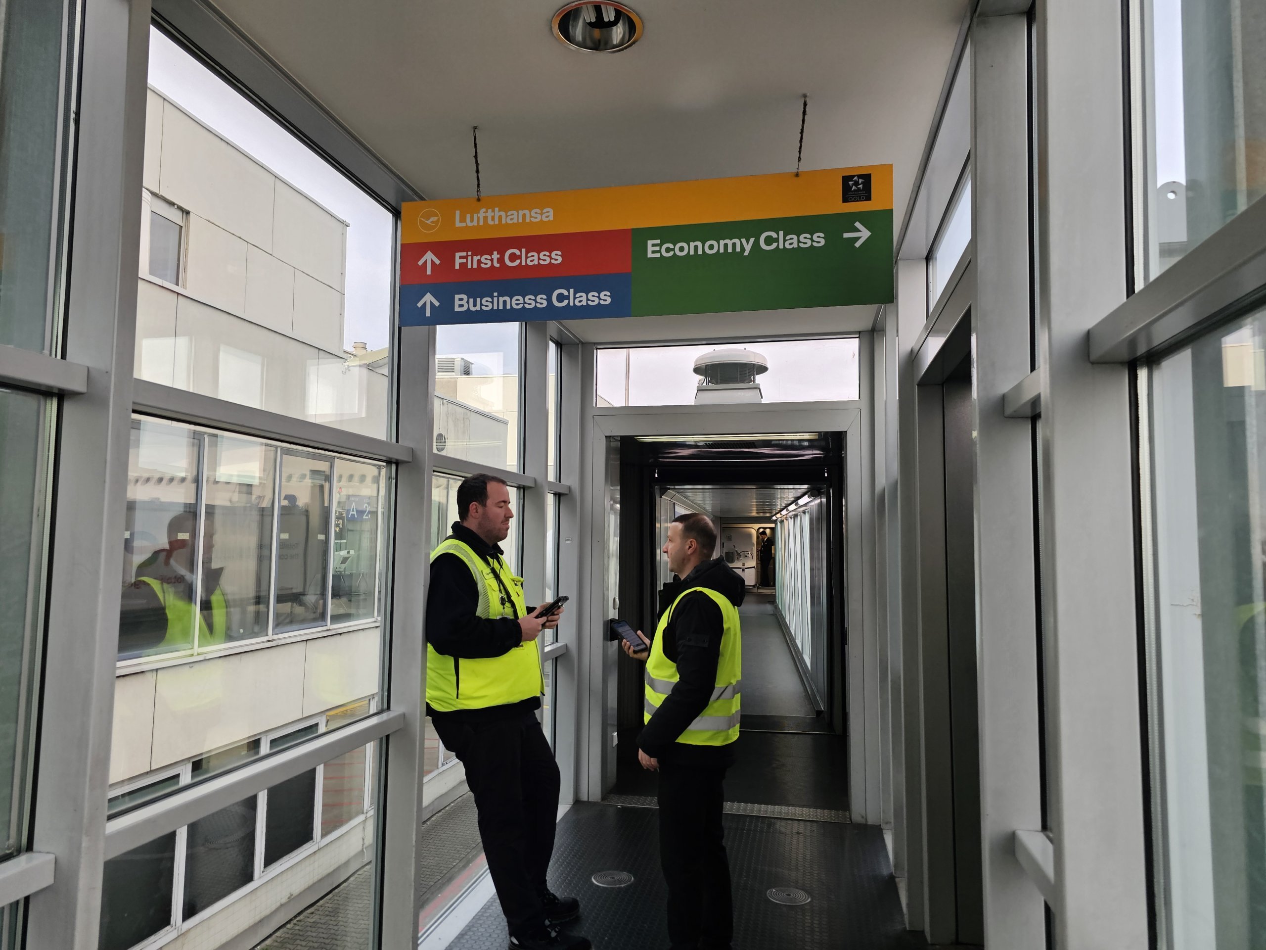 Iš automobilio išlipame ant asfalto, kur tada einame į vidų prie lifto, kuris mus nuveža prie standartinio įlaipinimo tiltelio.