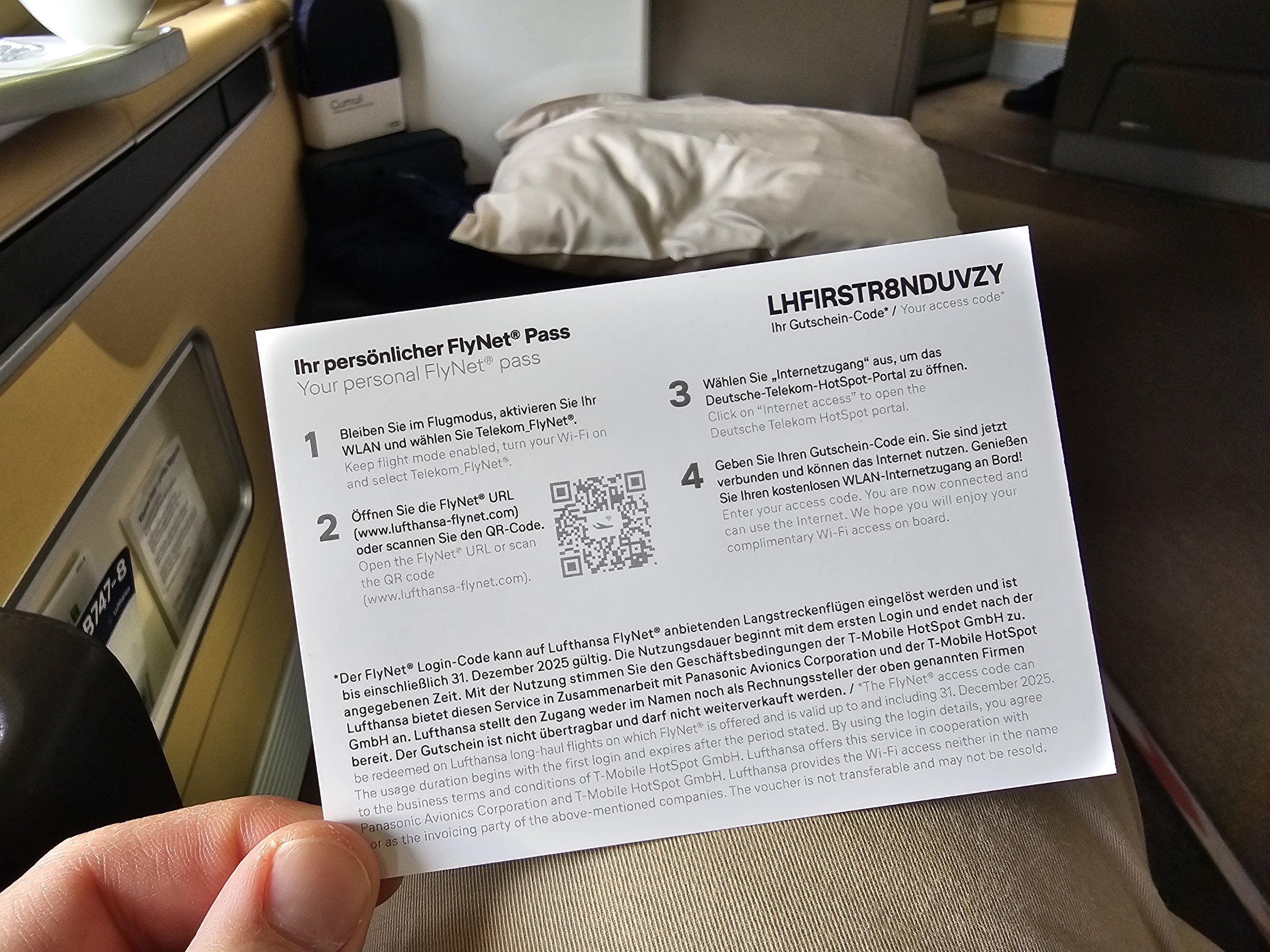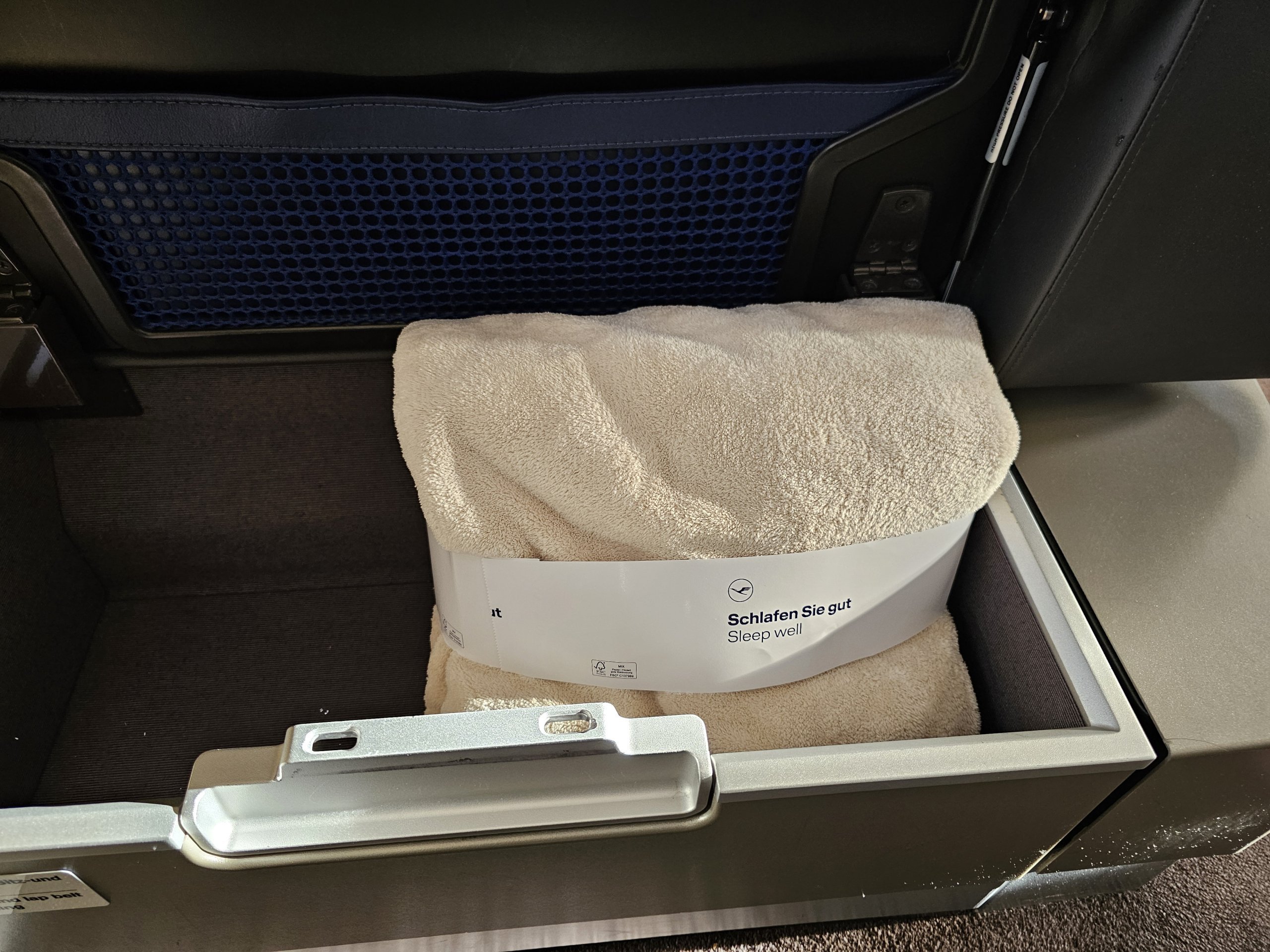 Sėdynėje įrengta itin patogi pagalvėlė ir antklodė, kuria galima naudotis bet kuriuo skrydžio metu. Miegojimui iš įgulos gausite dar vieną antklodę ir patalynę.