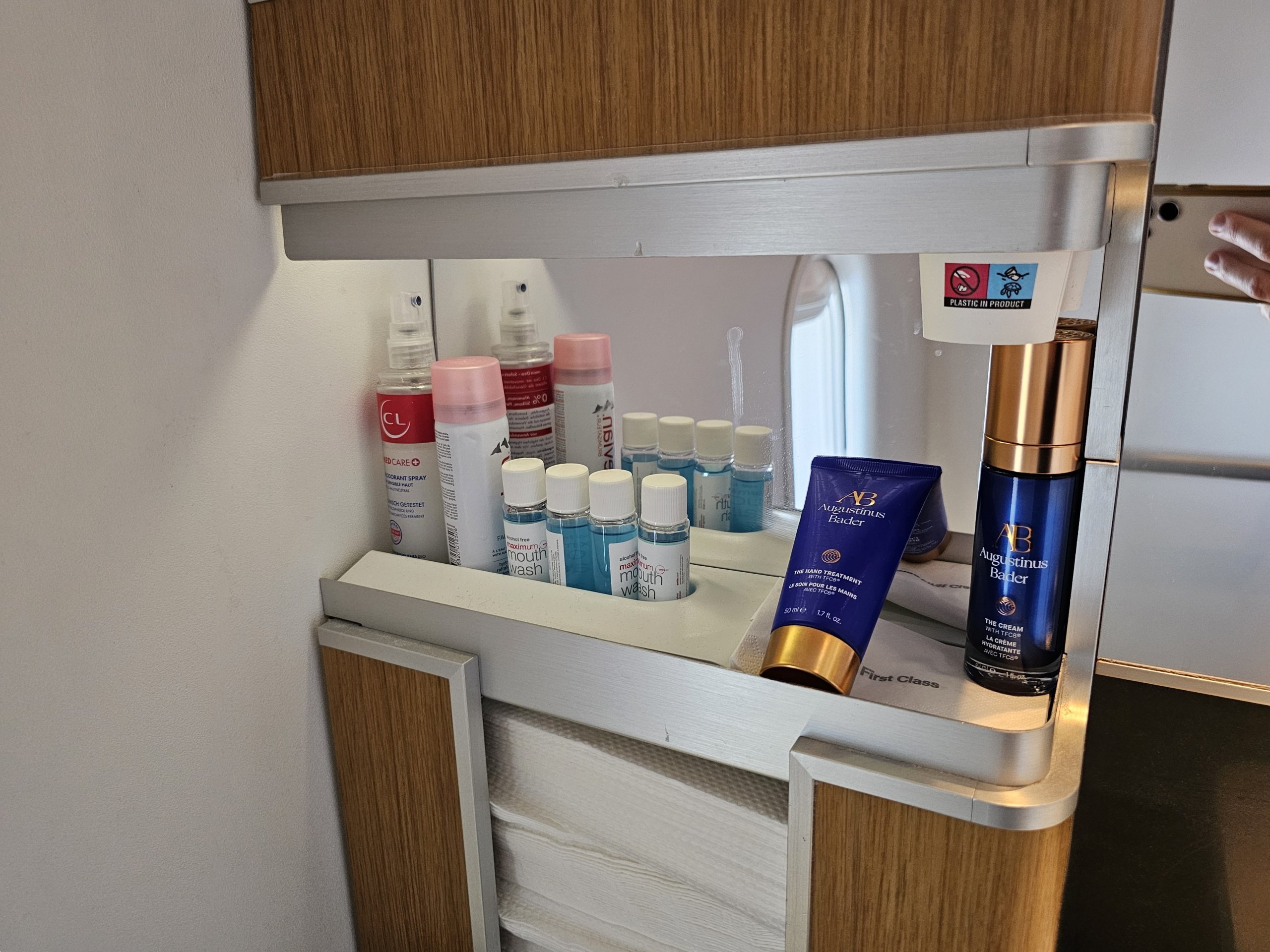 Tik pirmosios klasės tualetuose galite laisvai pasiimti burnos skalavimo skysčio, drėgnų servetėlių ar rankų kremų buteliukus.