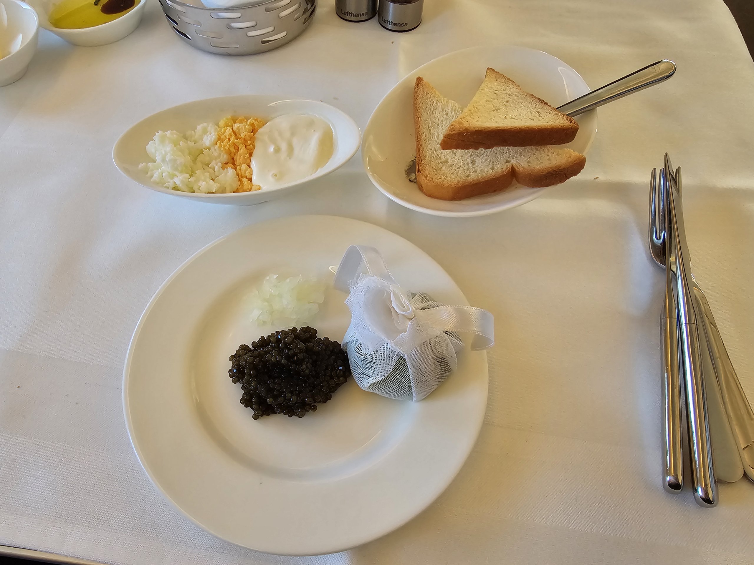 Dar prieš pagrindinį aptarnavimą patiekiami ikrai - firminis "Lufthansa" pirmosios klasės produktas. Ikrų aptarnavimas yra tiesiog šios oro linijų bendrovės sąvoka, kurią žino visi nuolatiniai keleiviai ir skrydžių entuziastai.