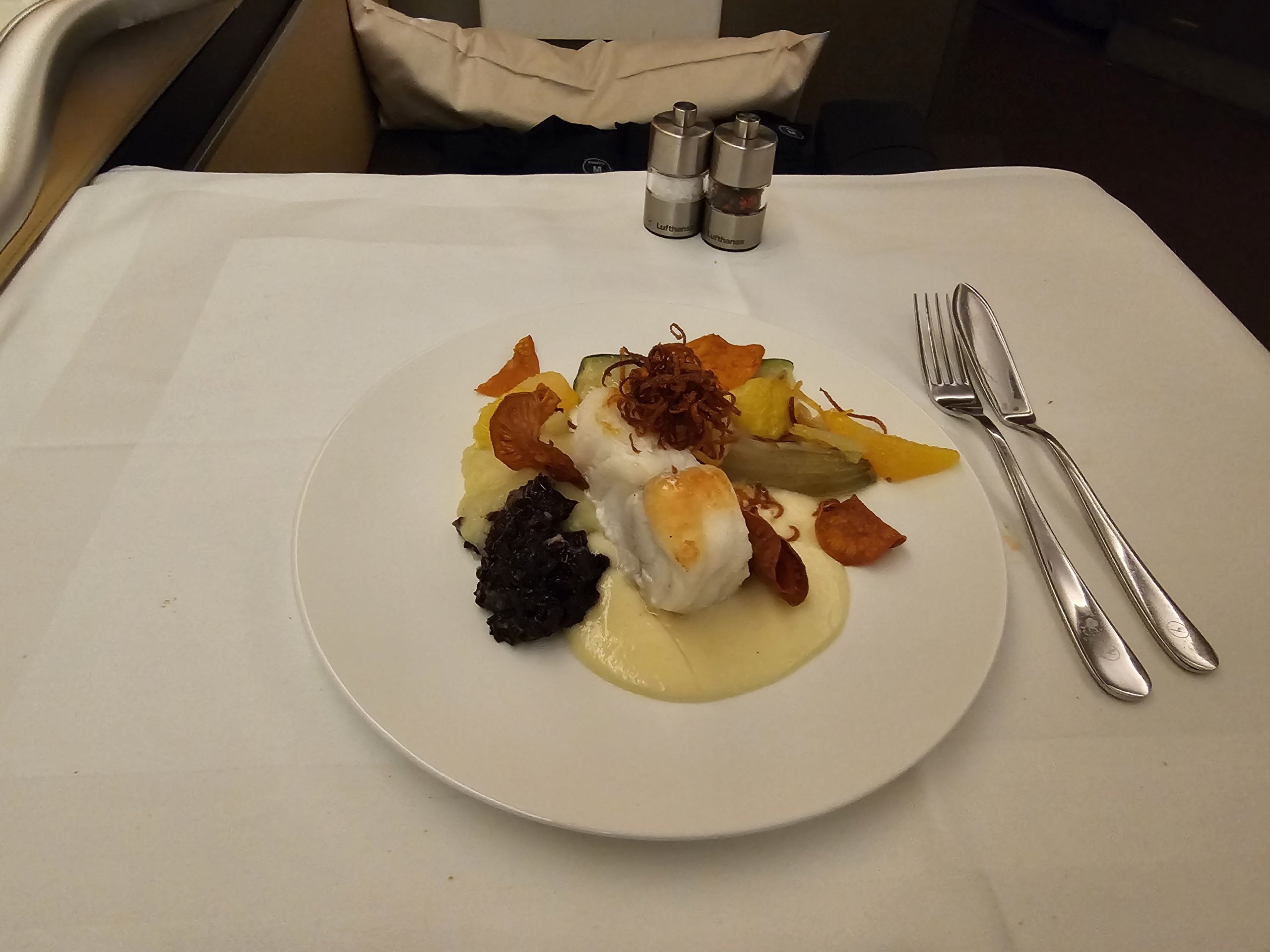 Pagrindiniam patiekalui pasirinkau žuvį - jūros velnią - su Beurre Blanc padažu. Šį kartą pateikimas man daug prastesnis nei užkandžių, tačiau patiekalas skanus ir, svarbiausia, lengvas. Būtent toks, kokį įsivaizduoju ilgo skrydžio metu.