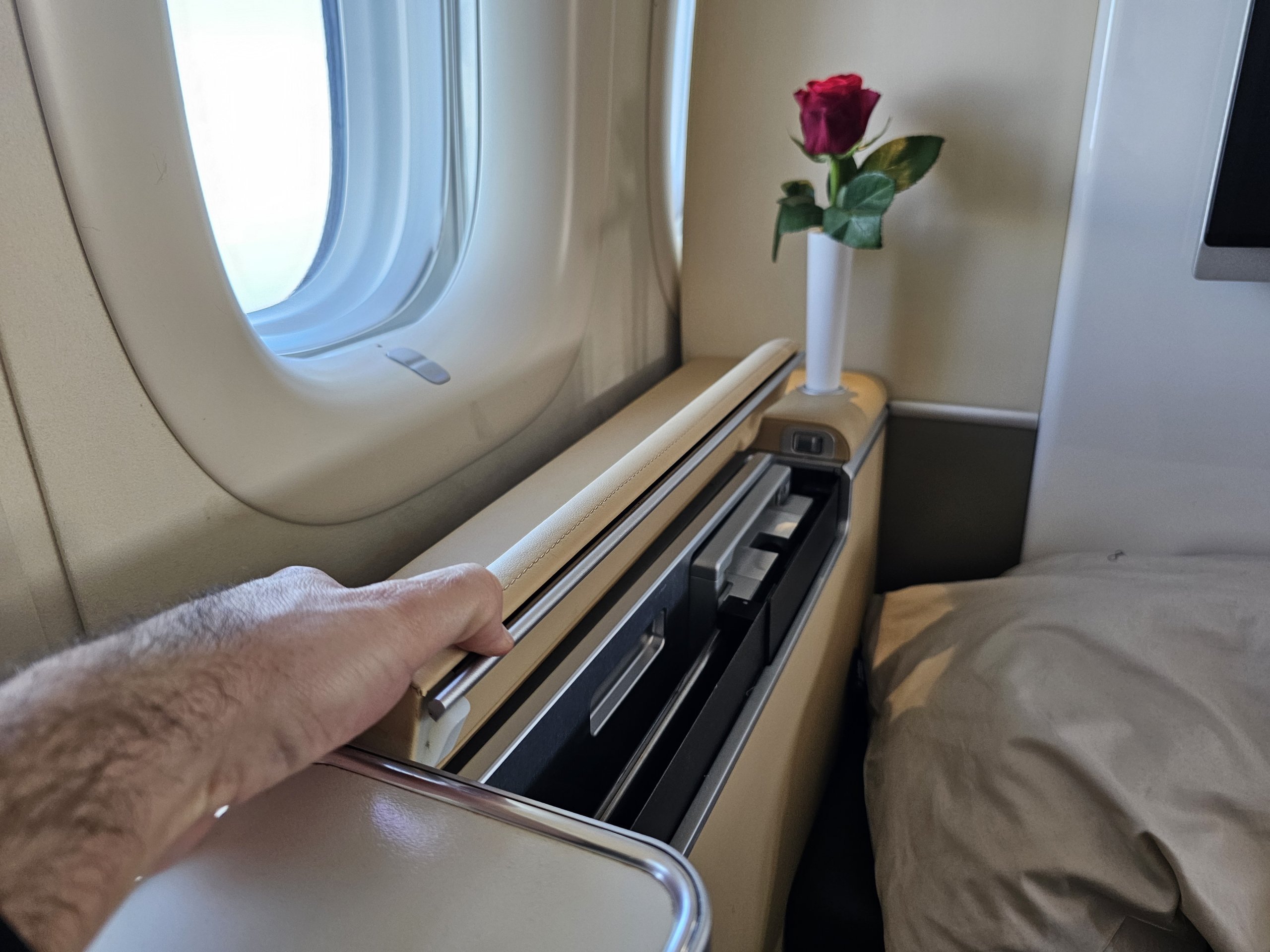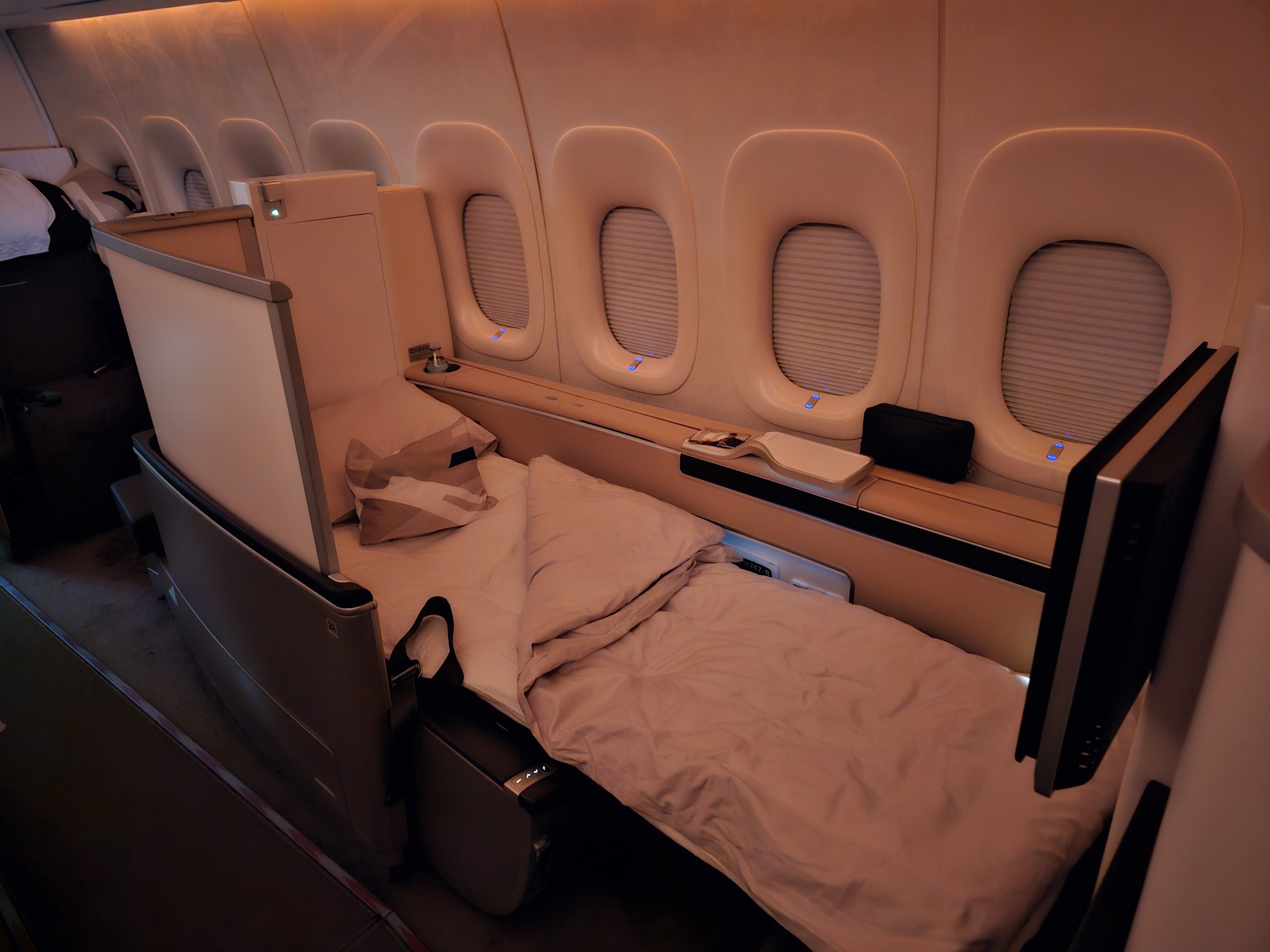 Sėdynėje yra ištraukiamas ekranas, bet tai ne visai tas pats. Privatumas tiesiog prilygsta geresnėms šiuolaikinėms verslo klasėms.