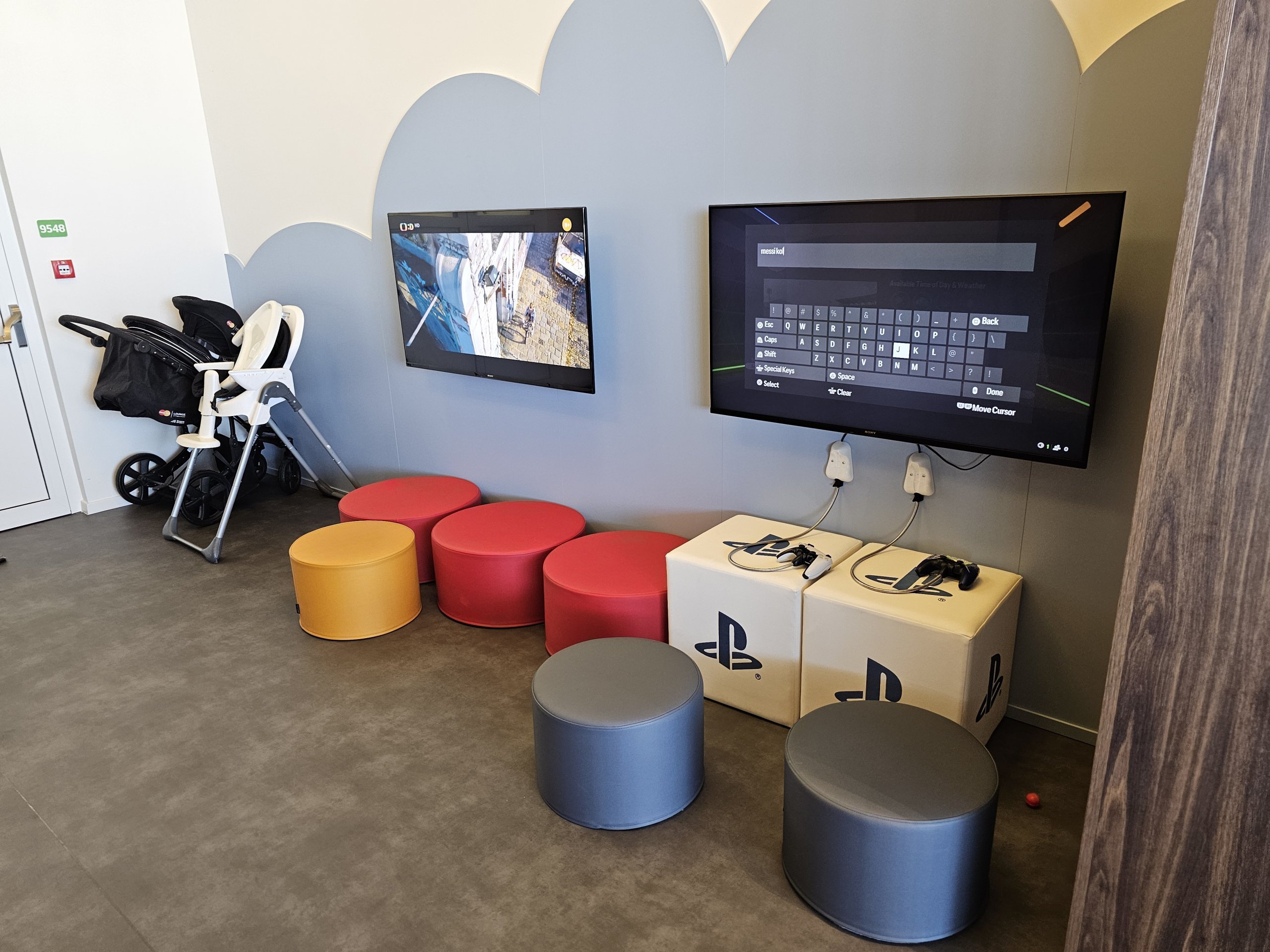 Mastercard Lounge salėje nėra vaikų kampelio mažesniems vaikams, tačiau jie gali naudotis nemokama playstation.