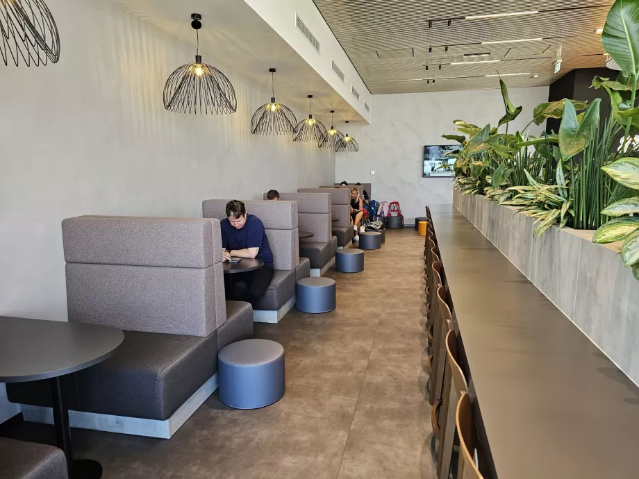 Visa viena salės pusė orientuota į orlaivių stovėjimo aikšteles, o palei langus įrengta daug valgomojo staliukų.