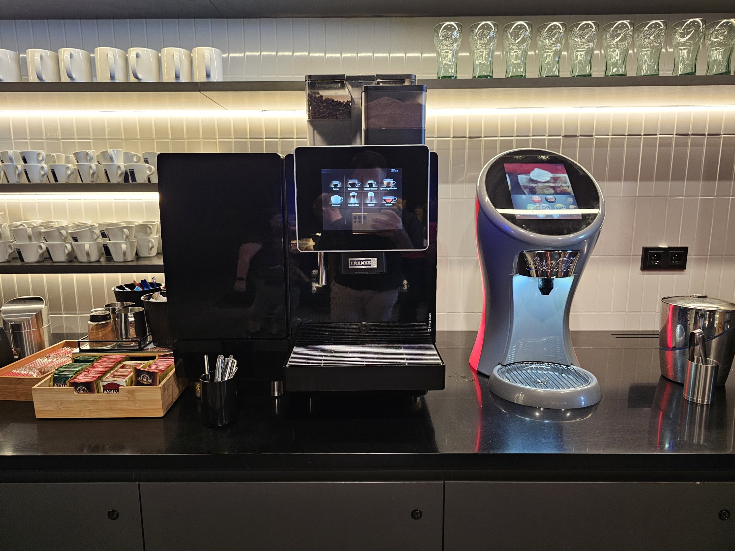 Abiejose salės dalyse taip pat galite naudotis kavos aparatais "Postmix", kuriuose pilstomi tokie gėrimai kaip "Coca Cola", "Coca Cola Zero", "Fanta" ar paprastas limonadas.