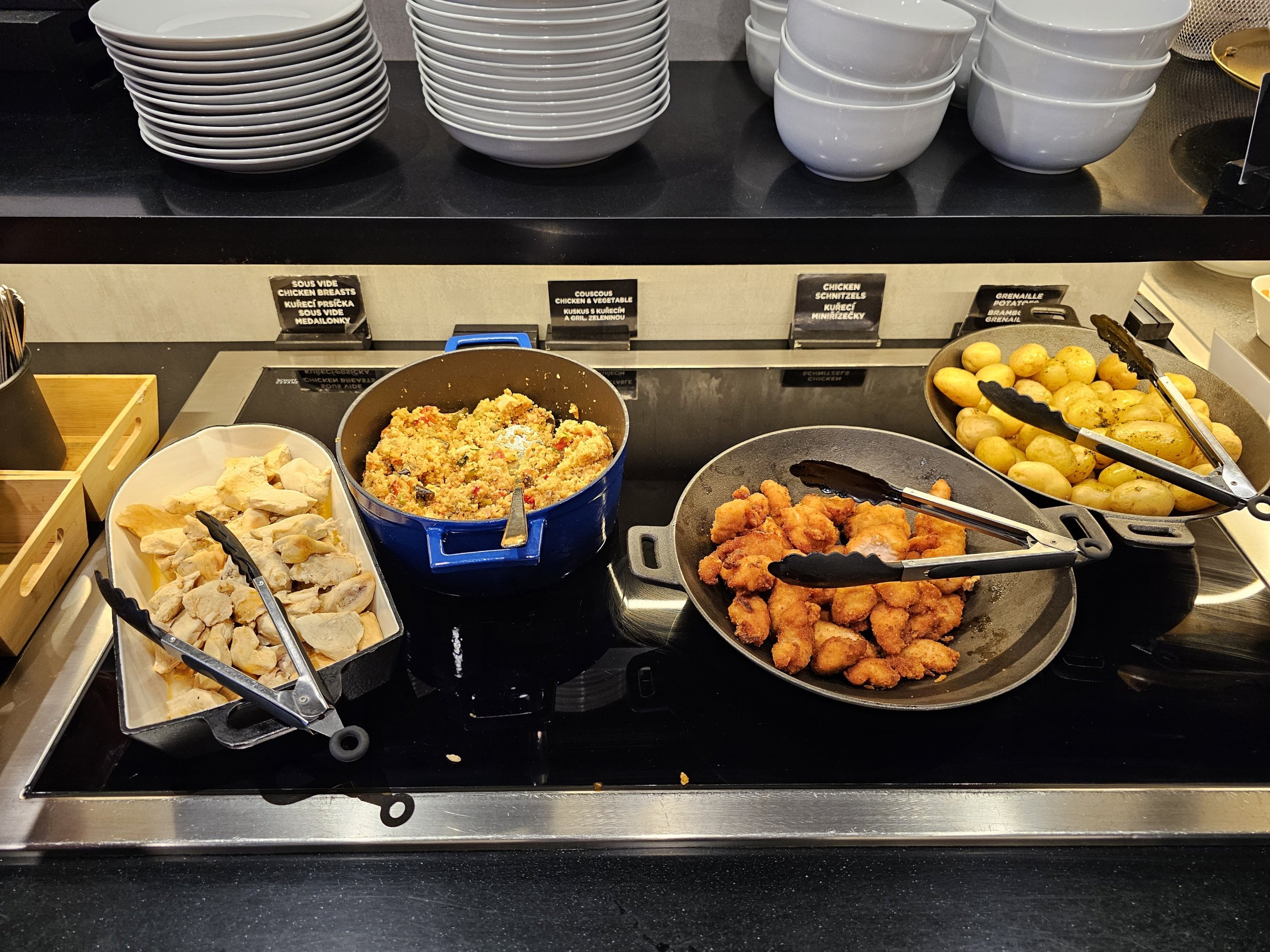 Nuo pietų paprastai siūlomi du karštieji patiekalai ir sriuba. Praktiškai niekada netrūksta mažų vištienos kotletų ir guliašo, kuris man nė vieno apsilankymo metu visiškai nepatiko.