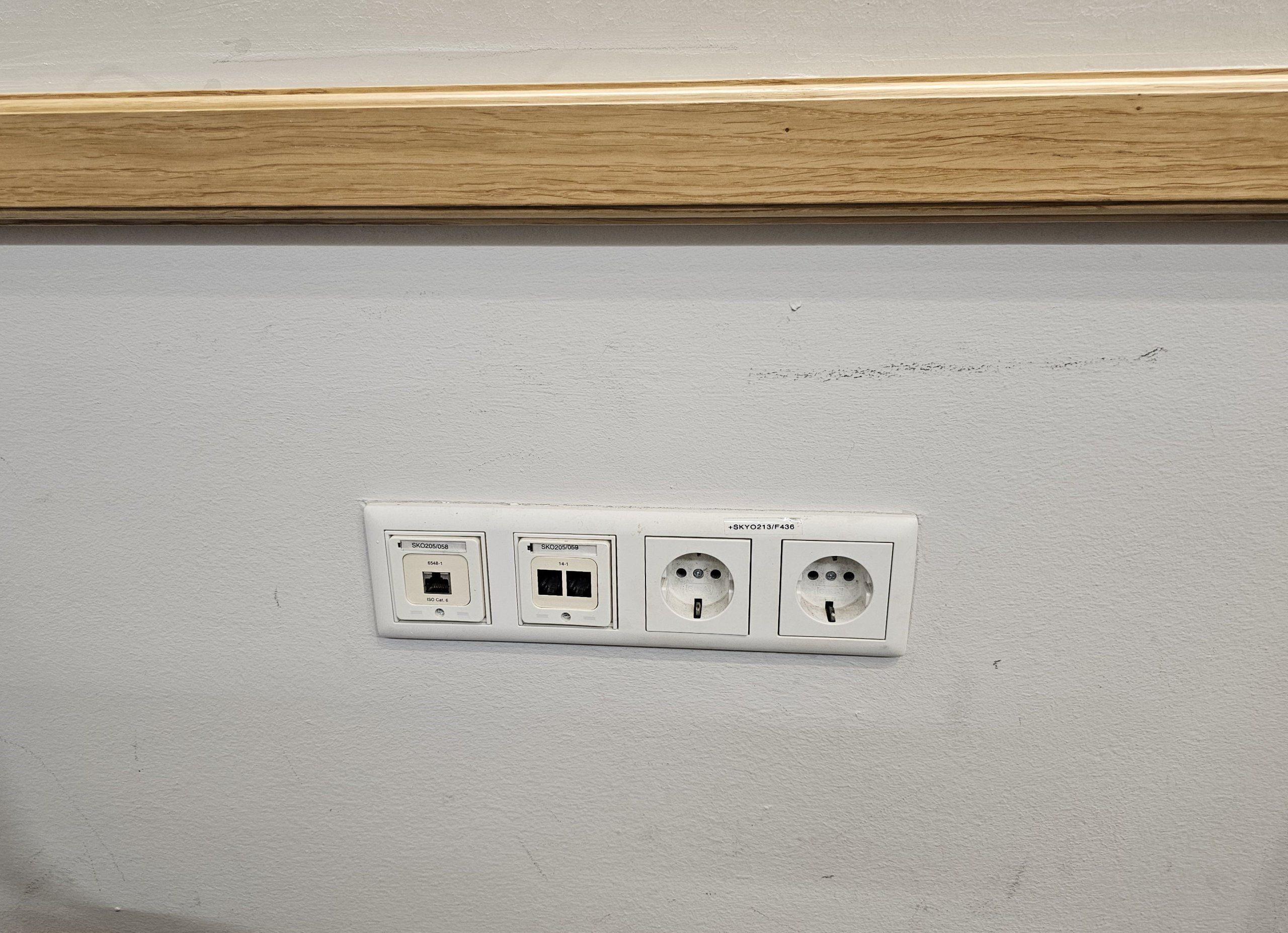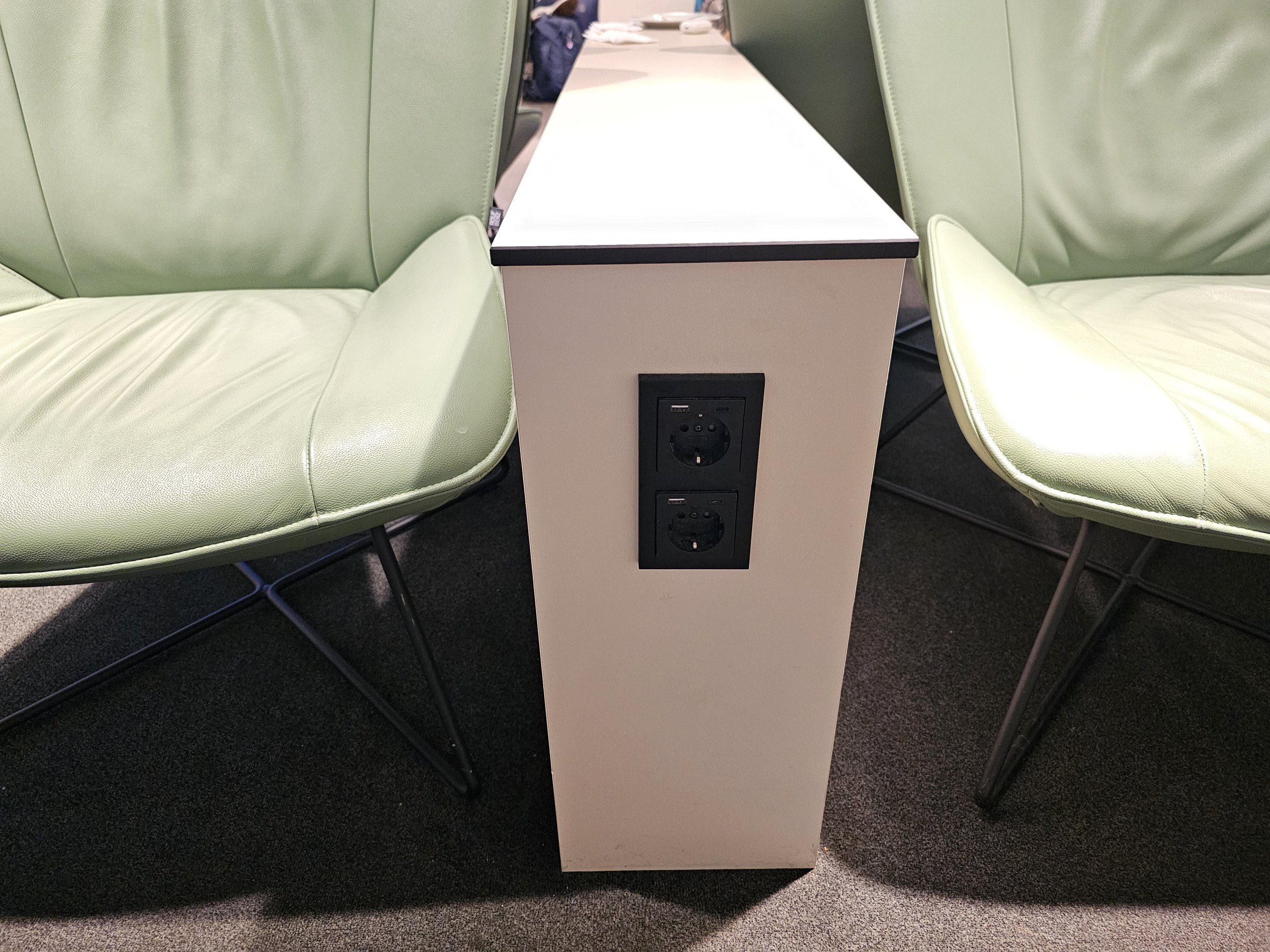 Daugumoje kėdžių ir visuose darbo paviršiuose yra kištukai elektronikai įkrauti.
