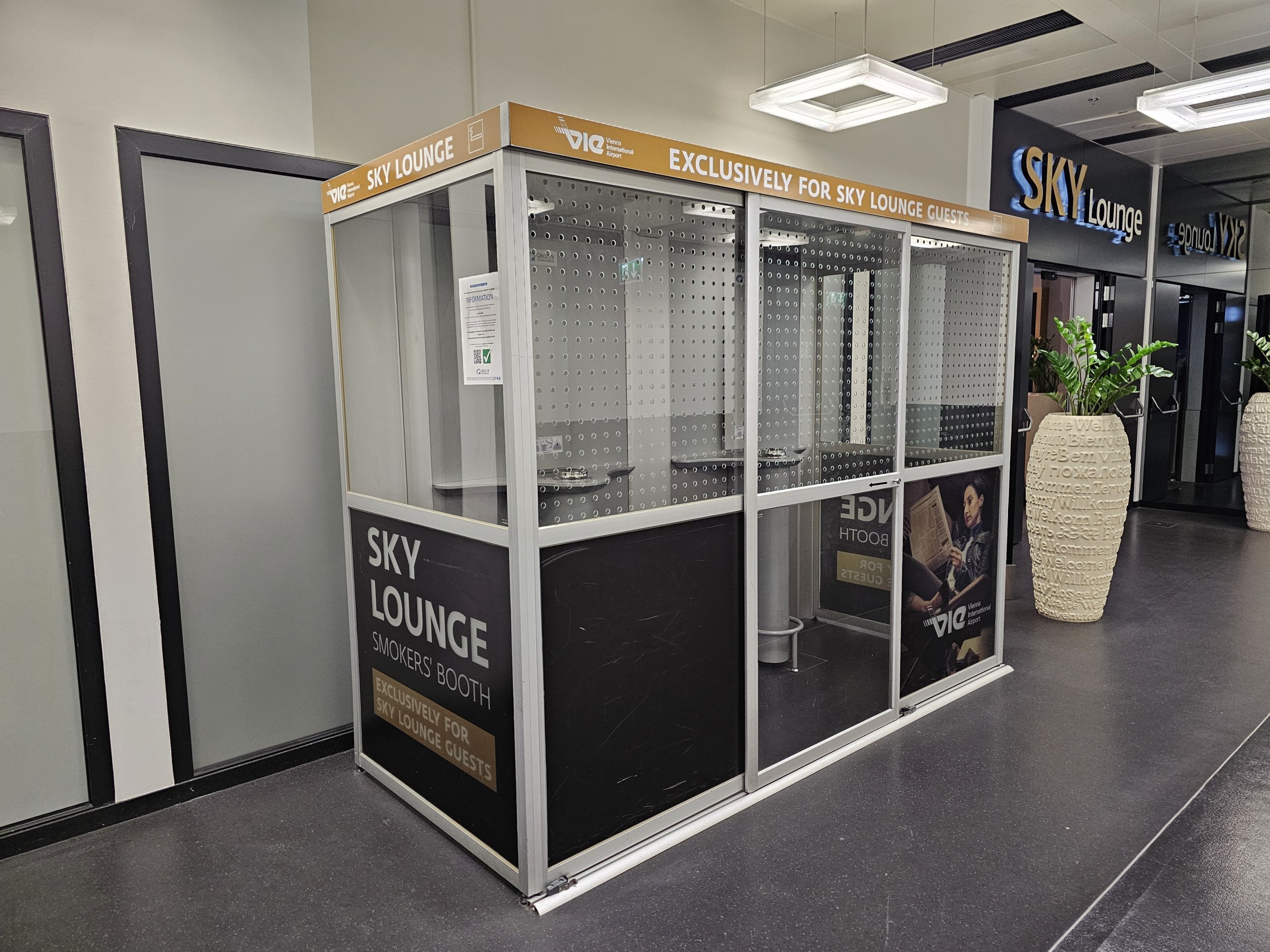 Prieš įeidami į poilsio kambarį rūkantieji gali pasinaudoti vėdinama kabina, skirta tik "SKY Lounge" lankytojams.