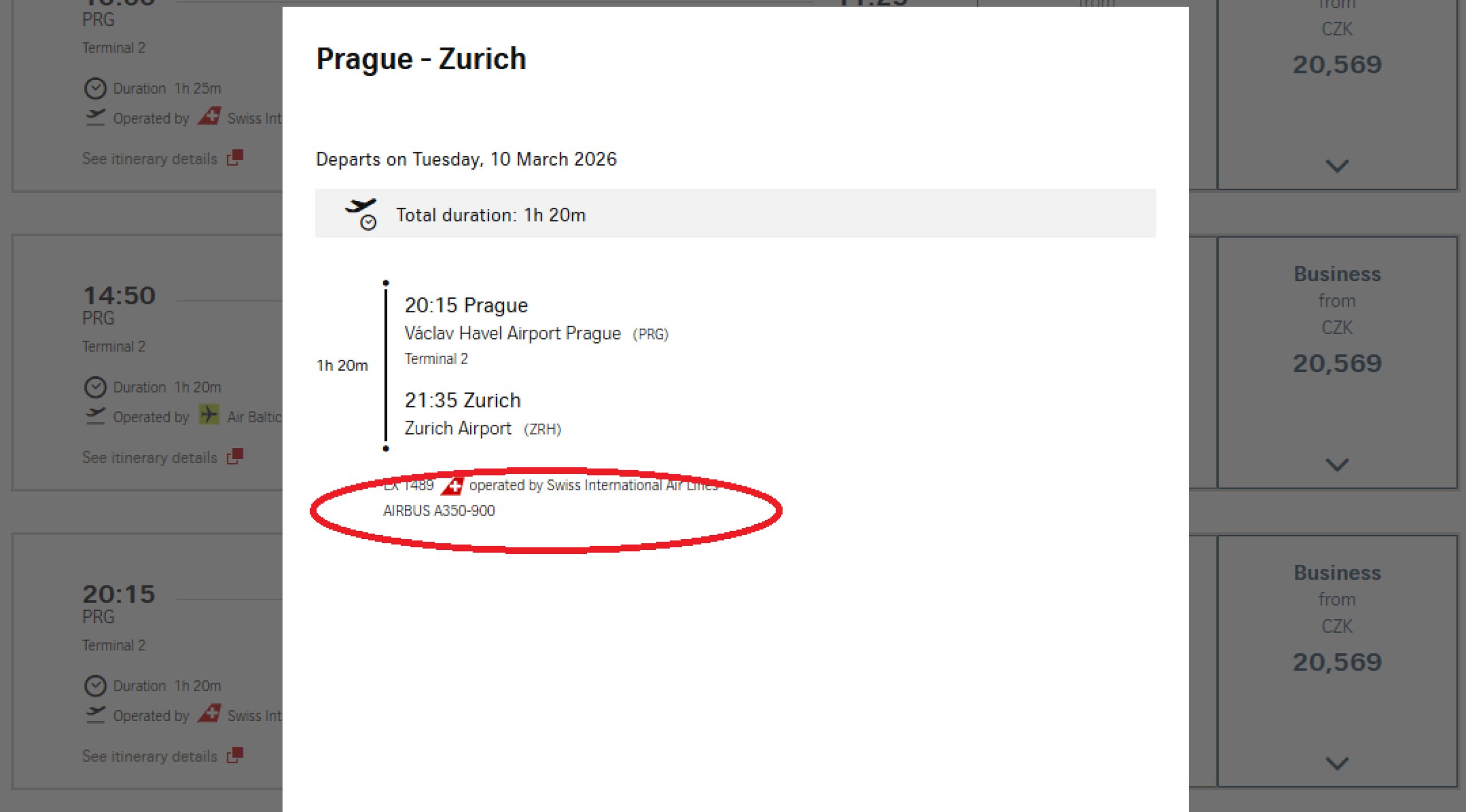 Lėktuvo tipas bus rodomas paspaudus ant konkretaus skrydžio swiss.com svetainėje: