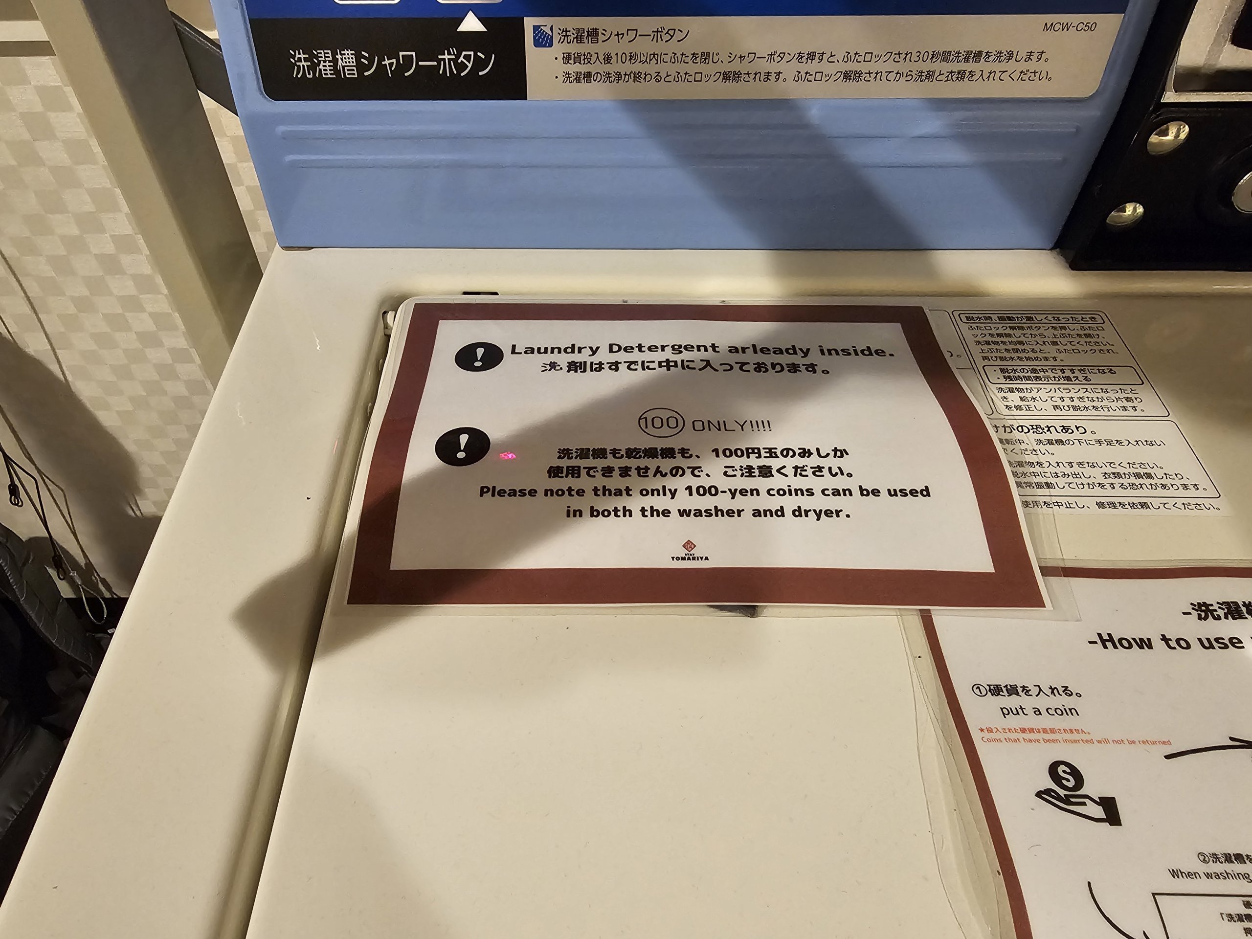 - skalbimo mašina ir džiovykle (300 jpių - galima atsiskaityti tik 100 jenų monetomis)