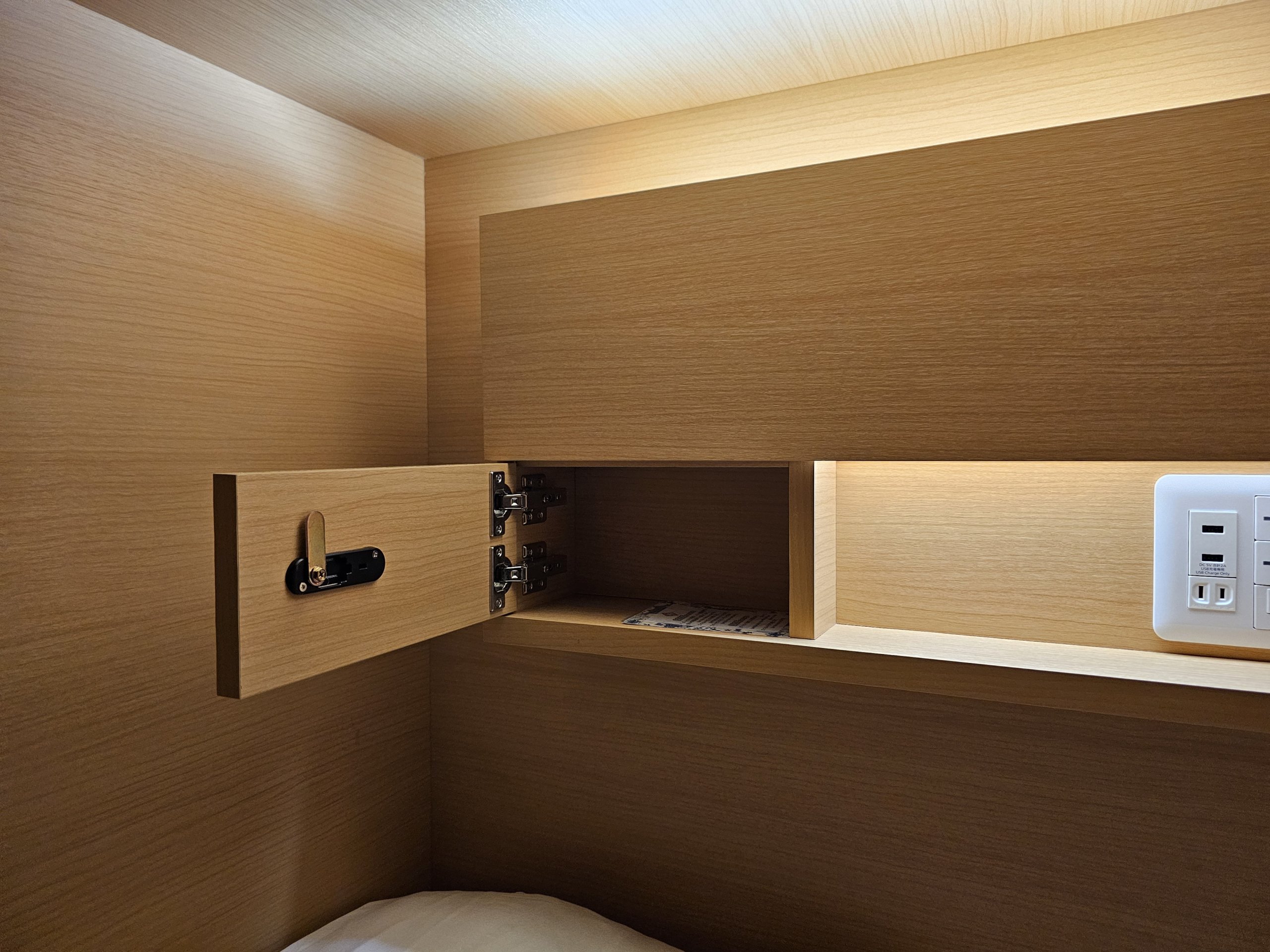 Viduje yra tik nedidelė rakinama spintelė mobiliajam telefonui, lemputė, kištukinis lizdas įkrovimui ir nedidelė lentynėlė telefonui, įkrovikliui ir galbūt nedideliam buteliukui gėrimo.