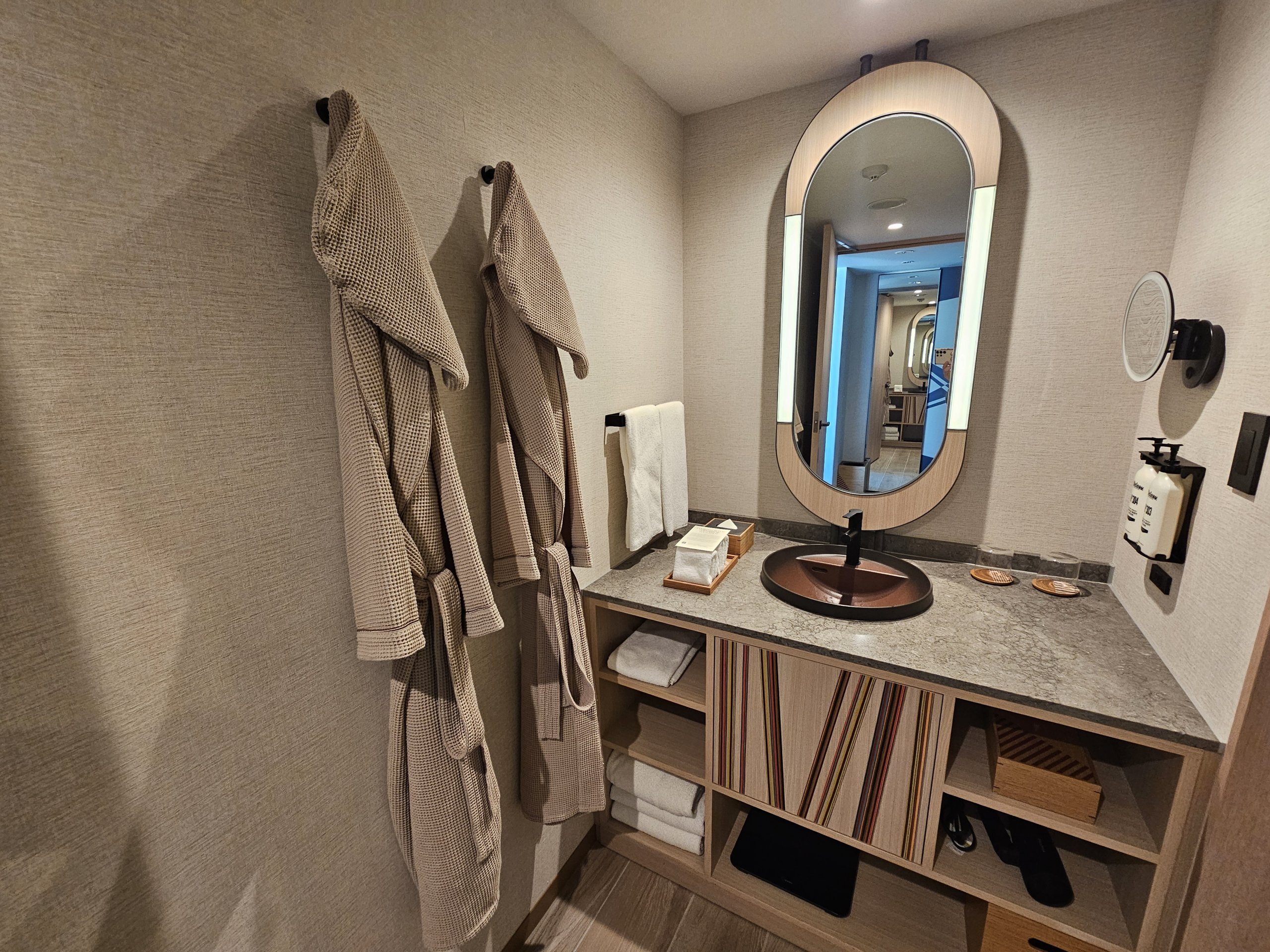 Elektros lizdai, įskaitant USB-A ir USB-C jungtis, yra ir prie lovos, ir ant staliuko su kavos virimo aparatu. Vienintelis dalykas, kuris mane šiek tiek trikdo, yra klimato kontrolė, esanti tik prieškambaryje, o ne prie pat lovos.