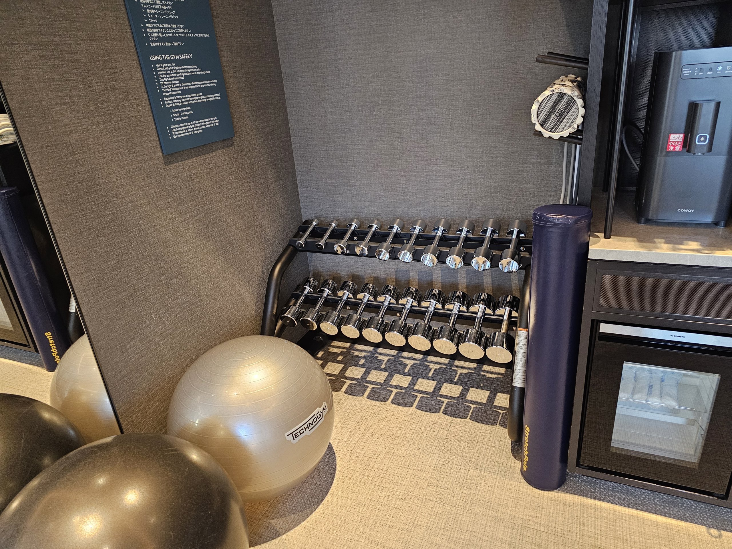 Tame aukšte, kur yra registratūra, yra gražus modernus, bet labai mažas sporto centras. Jis jau perpildytas, jame lankosi 3 žmonės. Jis veikia visą parą.
