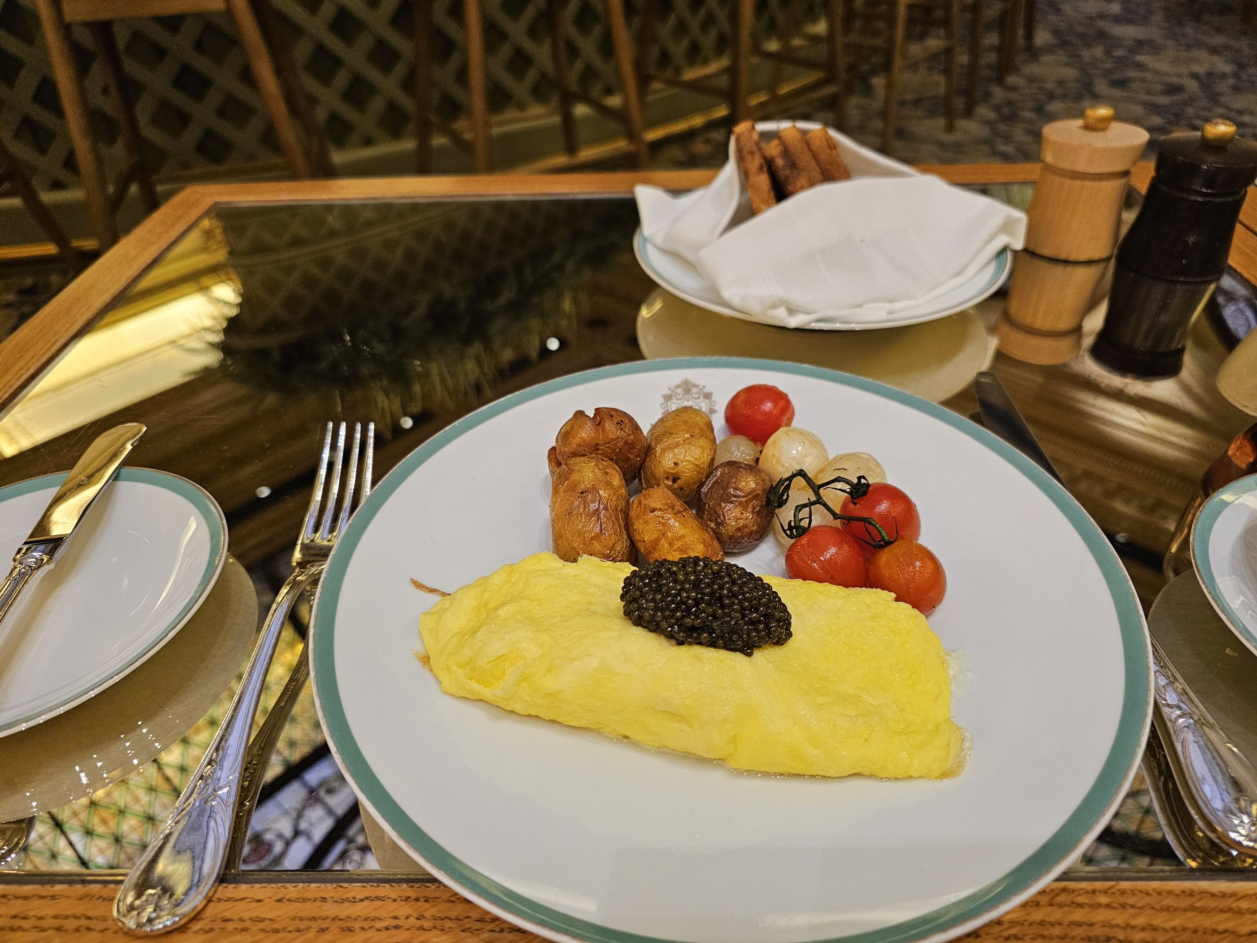 Pusryčiai patiekiami ir Palmių kieme, ir Šampanės bare - abiejose vietose galite užsisakyti identišką maistą.