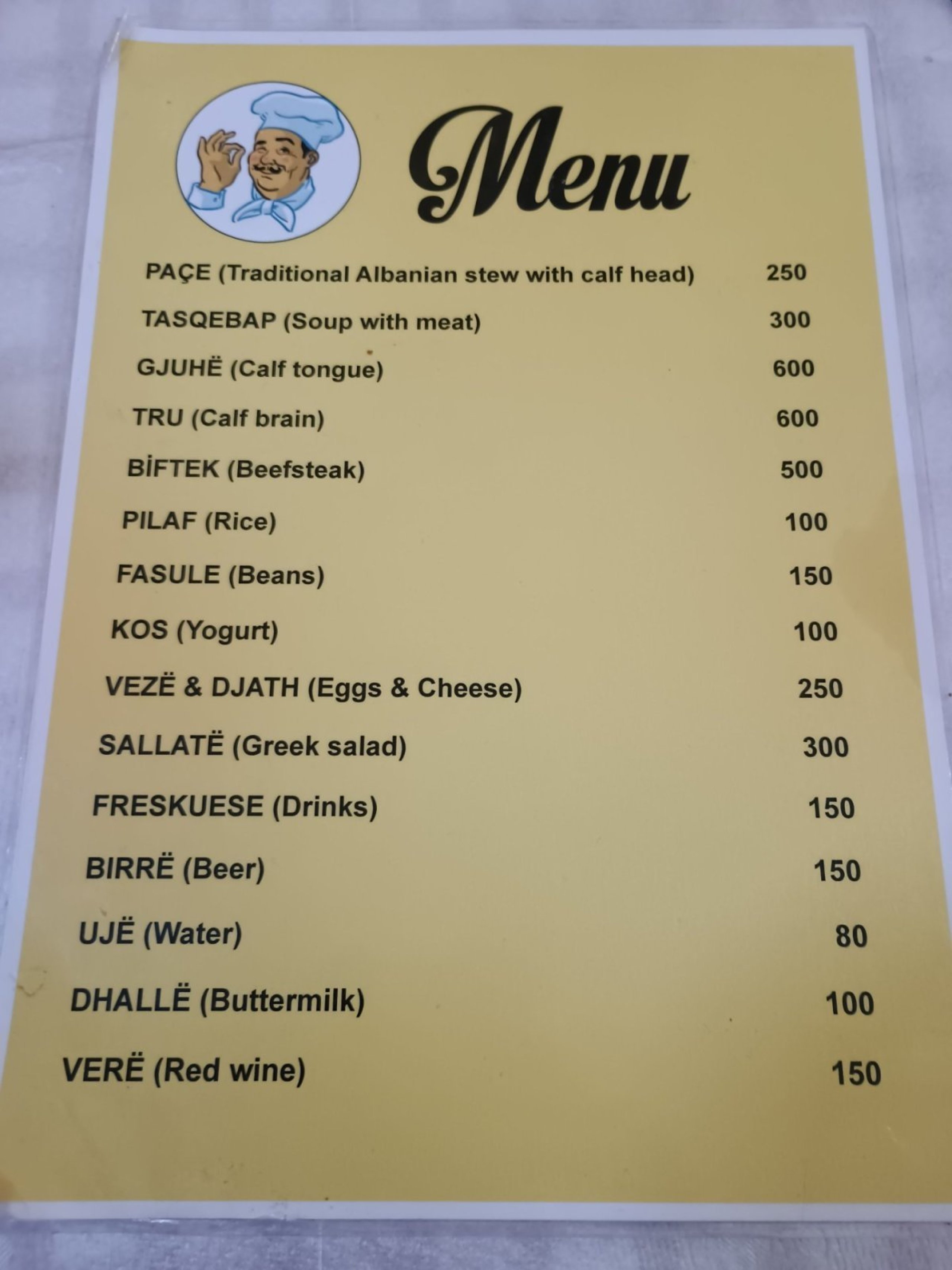 Pridedu įprasto albaniško ne turistinio restorano, esančio netoli Dračos autobusų stoties ir Tiranos turgaus, valgiaraštį - gana didelis skirtumas, palyginti su kainomis turistinėse vietose esančiuose restoranuose.