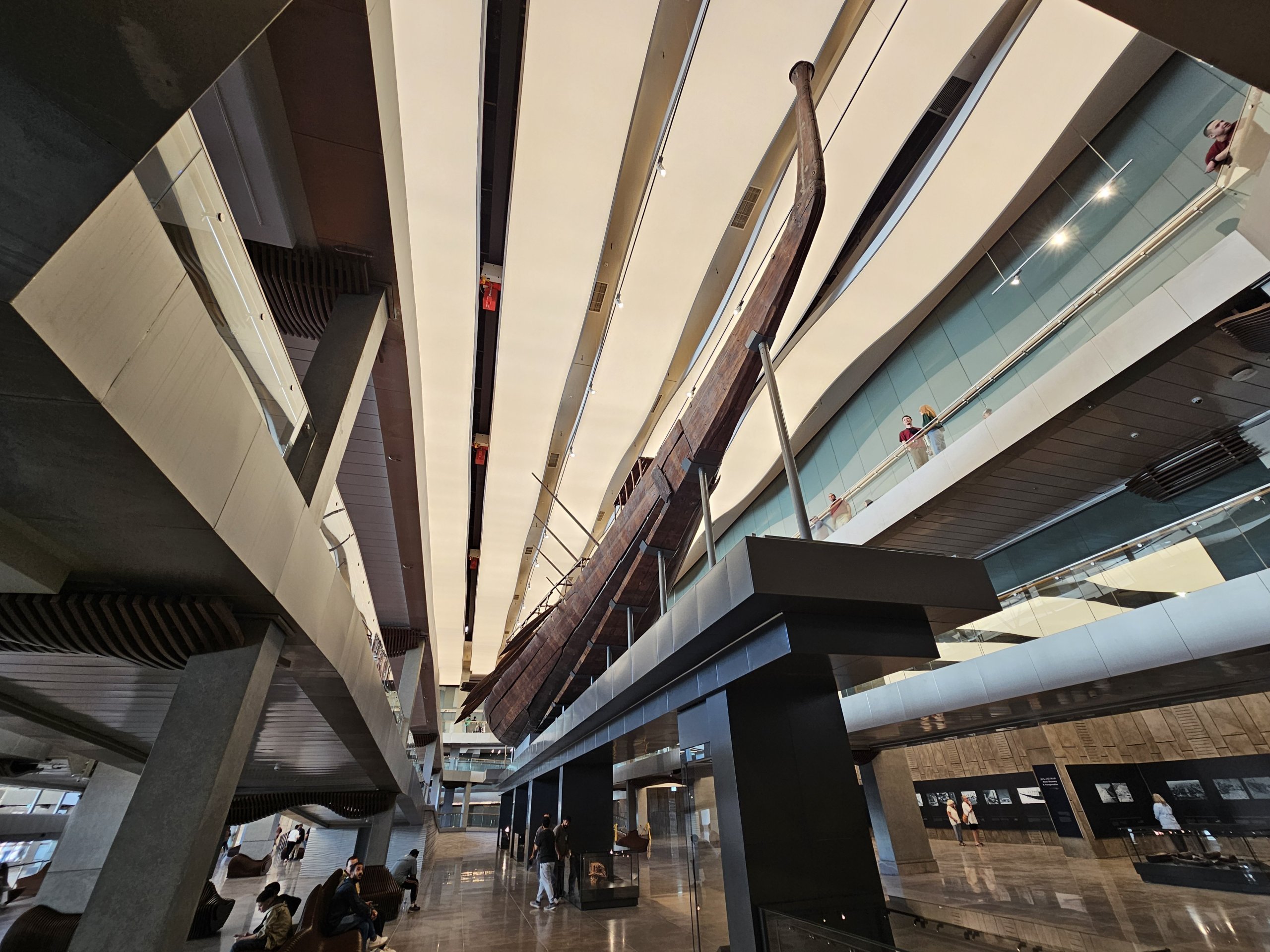 Iš didžiosios salės rekomenduoju eiti tiesiai į priešais esantį mažesnį pastatą, kuriame eksponuojamos dvi tikslios karaliaus Chufu medinių laivų kopijos.