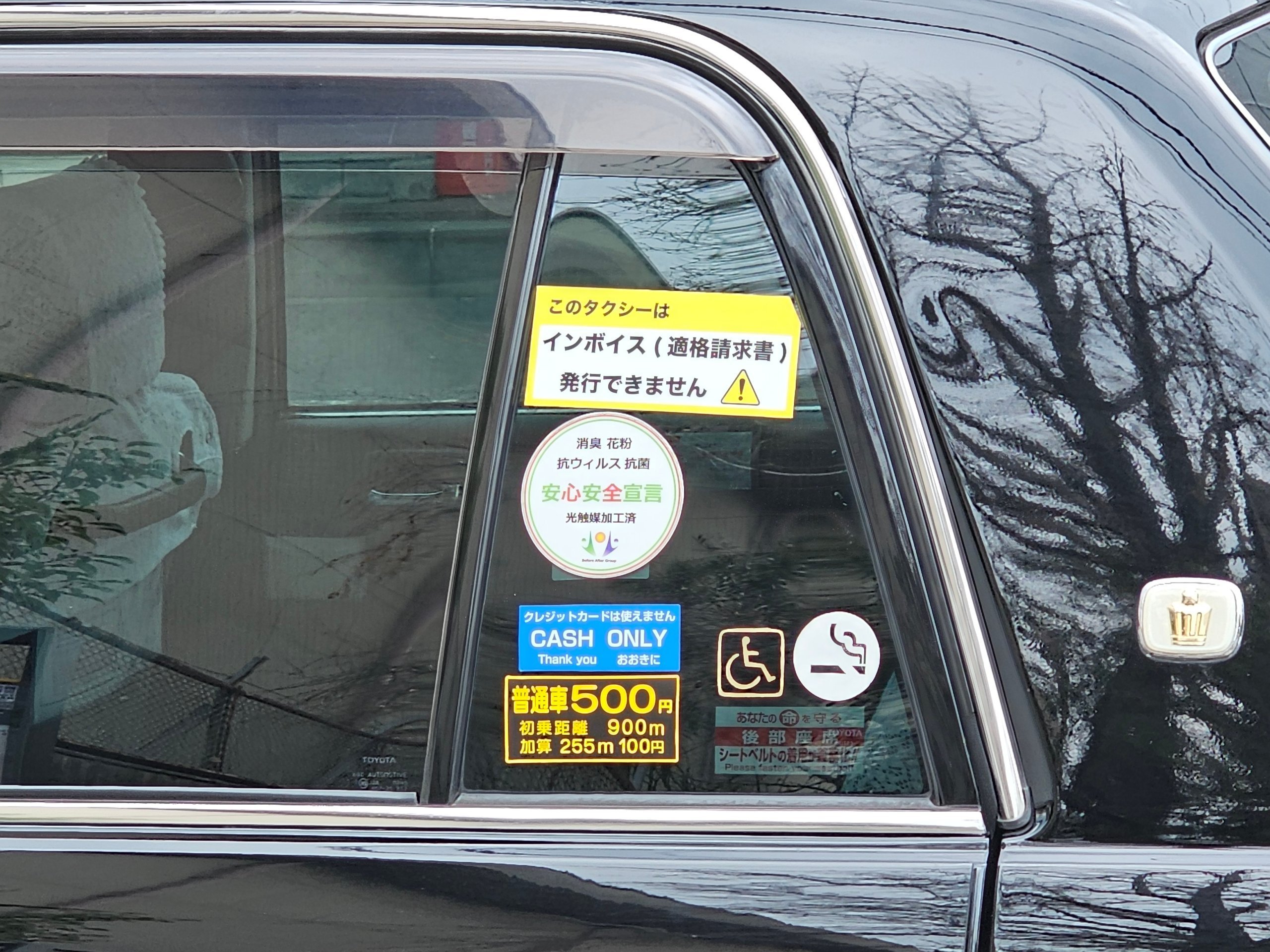 - 80 jpy - kas 296 metrai arba 1 minutė laukimo (didesniems taksi automobiliams taikoma šiek tiek didesnė kaina)