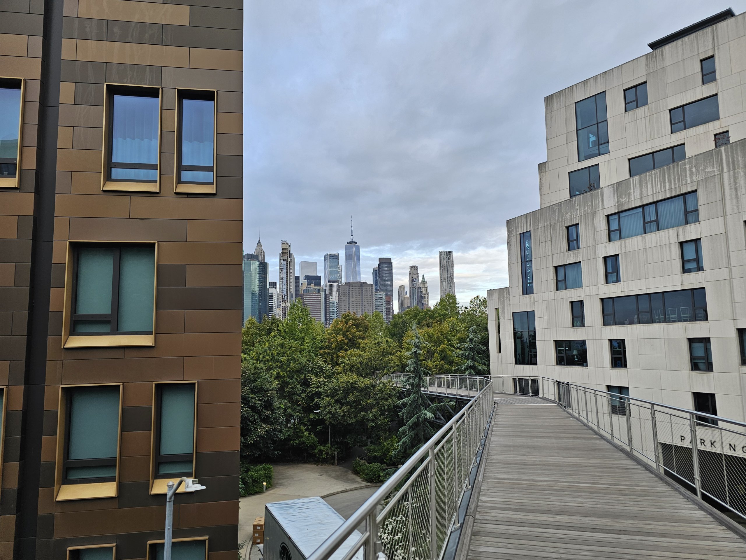 Įdomūs vaizdai ne tik į tolimąjį Manhataną, bet ir į vieną iš Bruklino tilto polių atsiveria nuo trumpo pėsčiųjų tilto, esančio Skvibo parke, kuris tiesiogiai ribojasi su Bruklino tilto parku.