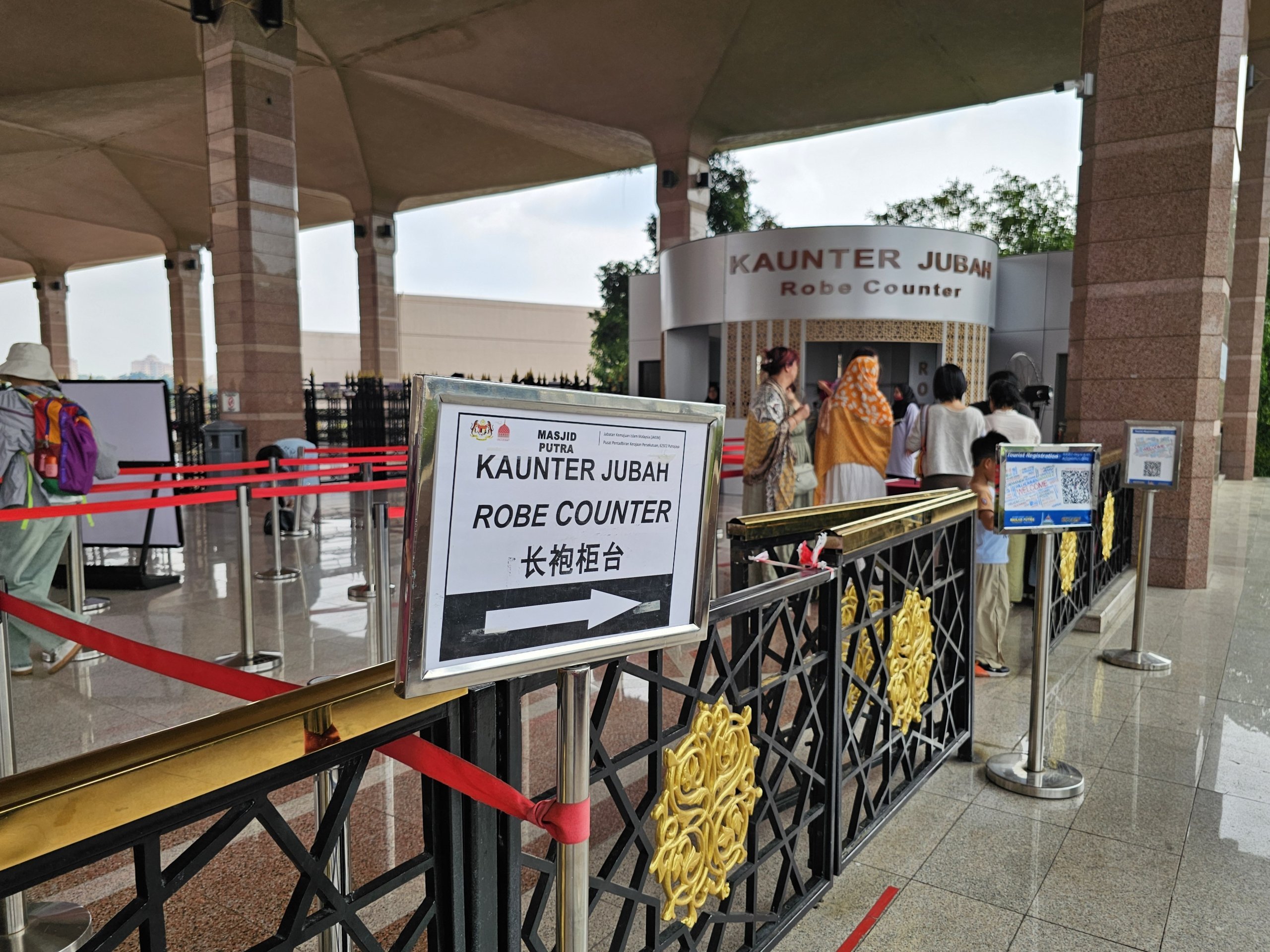 Į mečetės vidų galima įeiti tik ant kelių ir pečių. Jei dėvite trumpas kelnes arba liemenėlę, prie įėjimo galite nemokamai pasiskolinti chalatą.