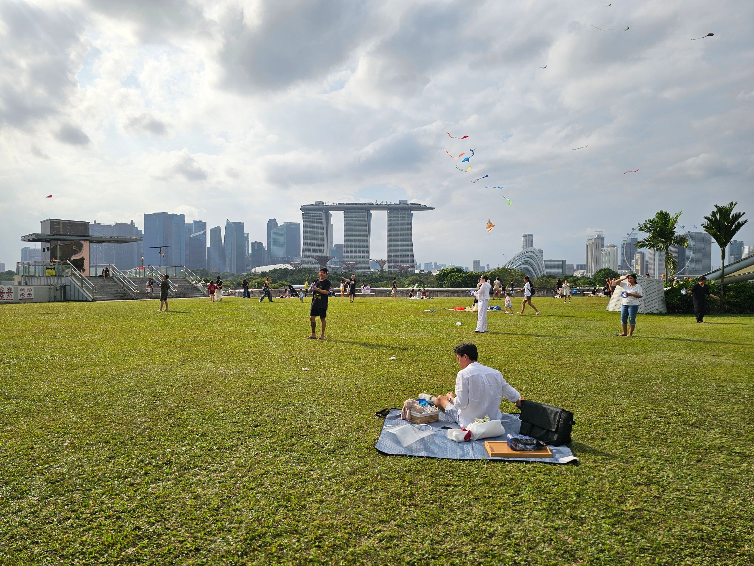 Tiesiog didelė žolėta aikštelė ant užkardos stogo, nuo kurios matosi visa Marina Bay panorama - įskaitant Marina Bay Sands ir Gardens by the Bay.