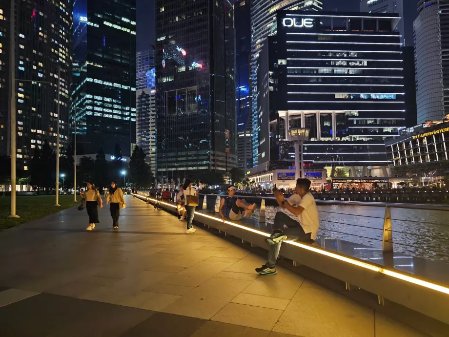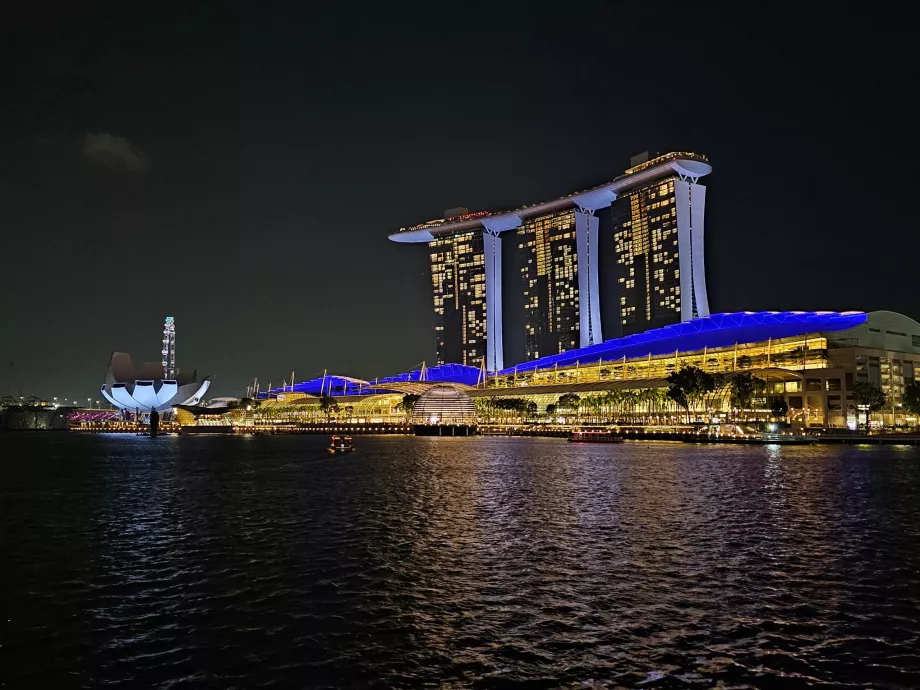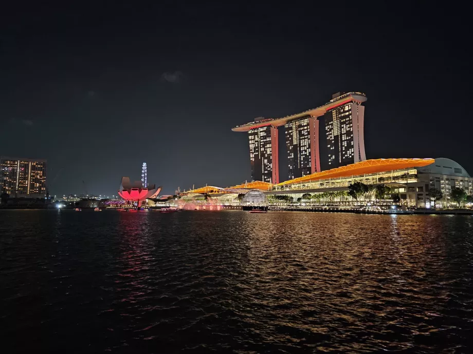 Jos grožis ypač atsiskleidžia naktį apšviestuose dangoraižiuose, viešbutyje " Marina Bay Sands", ant kurio stogo įrengtas visame pasaulyje žinomas baseinas, apžvalgos rate ir palei įlanką stovinčiose liūtų statulose.