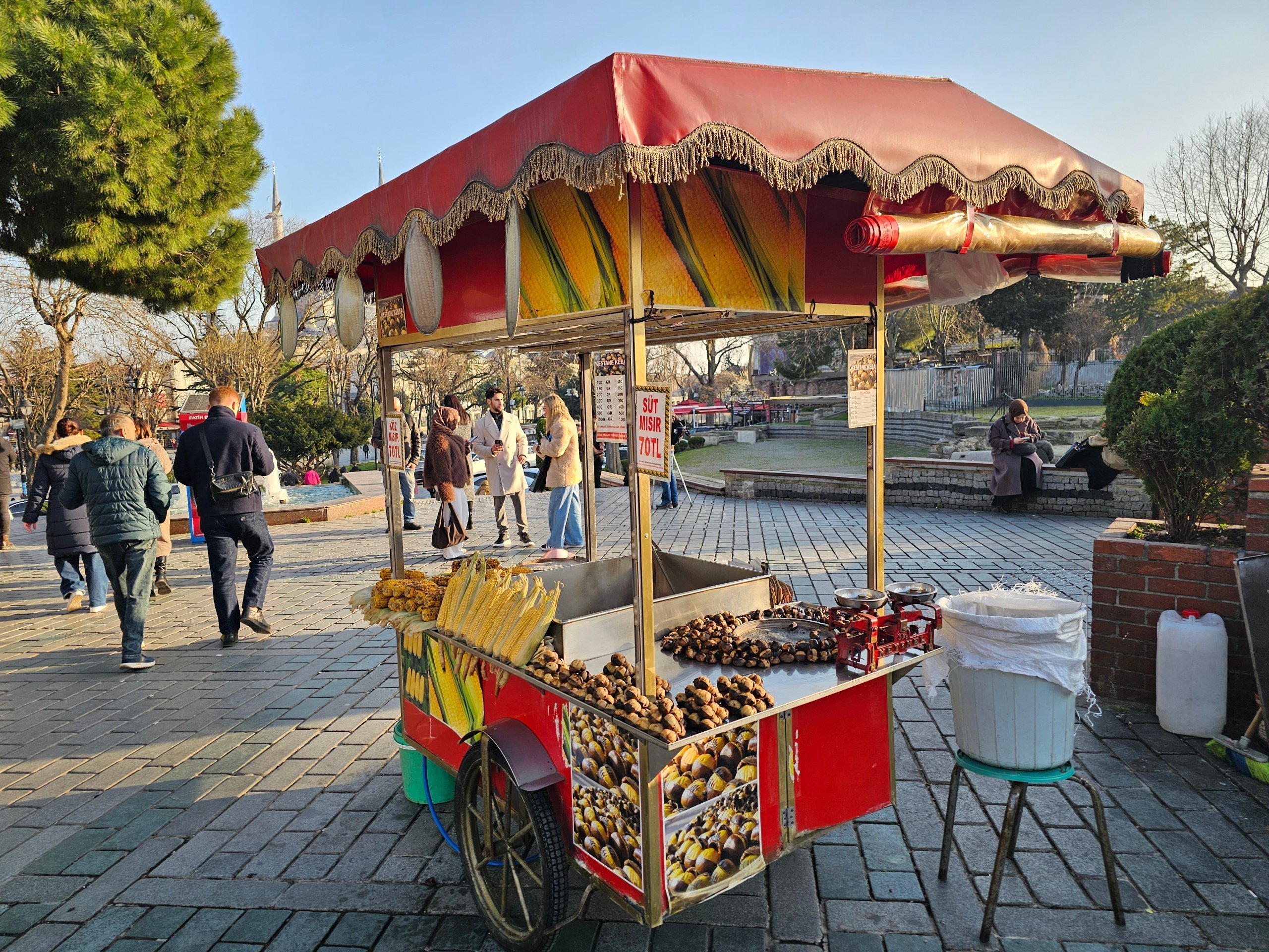 Specifinė Stambulo kultūra - visur esantys prekystaliai su virtais kukurūzais ir keptais kaštonais.
