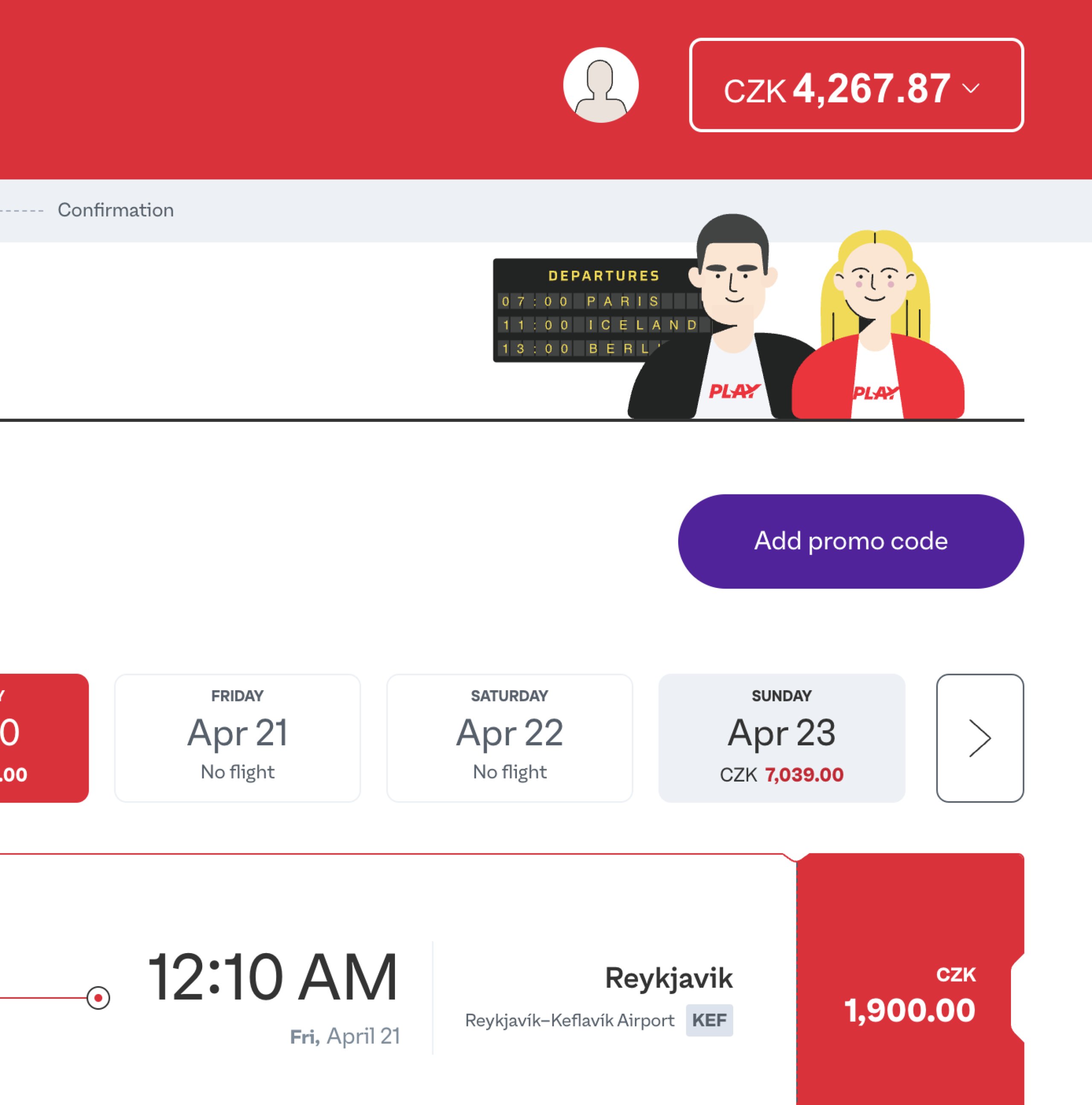 Ar turite galiojantį ir aktualų "Play Airlines" reklaminį kodą ir nežinote, kur jį įvesti? Pirmiausia ieškokite skrydžių, kalendoriuje pasirinkite konkrečias datas ir pereikite prie išsamaus skrydžių tvarkaraščio.