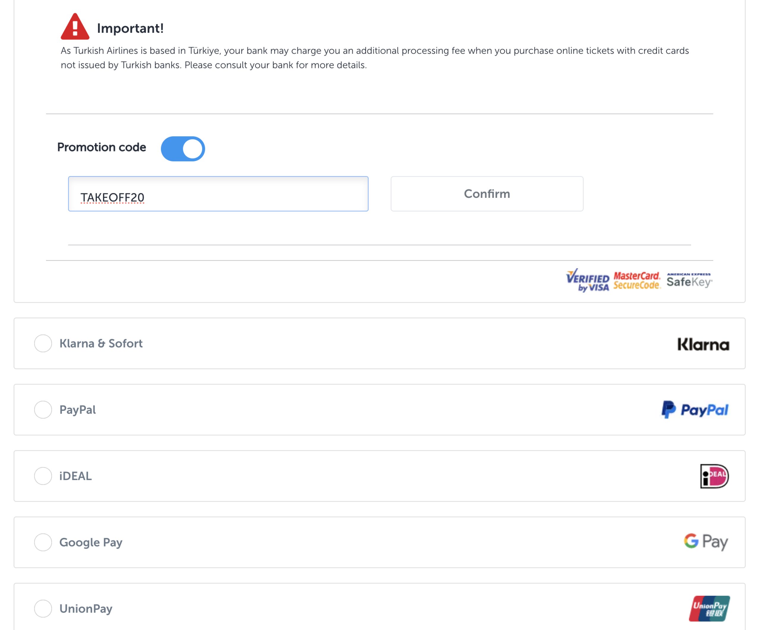 "Turkish Airlines" reklaminį kodą galite taikyti galutiniame kasos puslapyje.