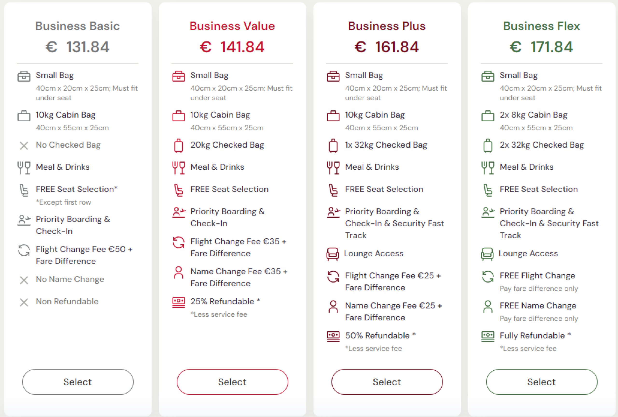 Registruotas bagažas net neįtrauktas į visų verslo klasės bilietų kainas, o gaivieji gėrimai paprastai patiekiami šalti.